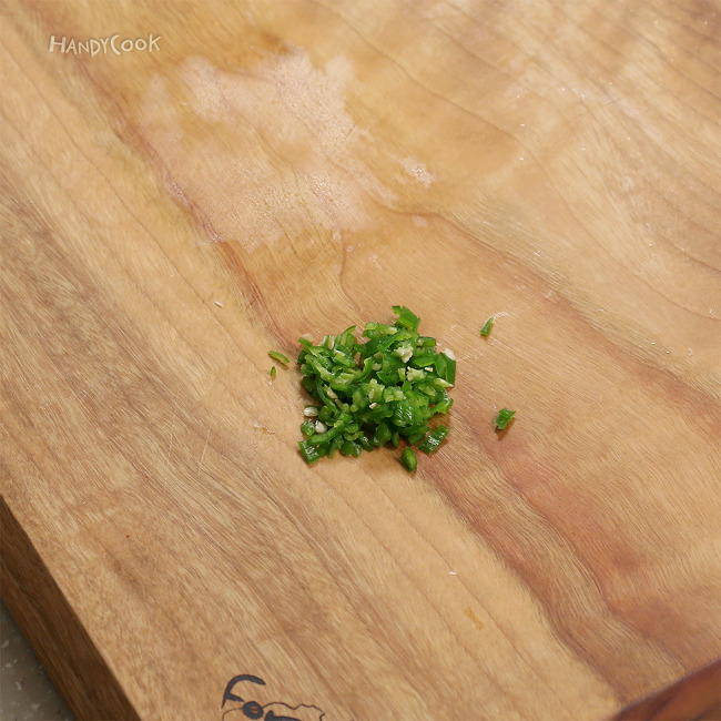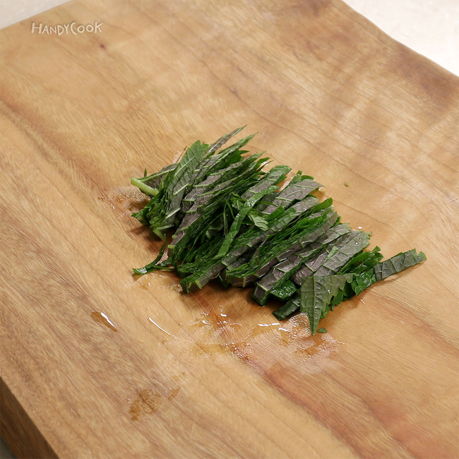 2. 깻잎은 길게 반으로 썬 뒤 채 썬다. 양파, 대파, 청양고추는 잘게 다진다.