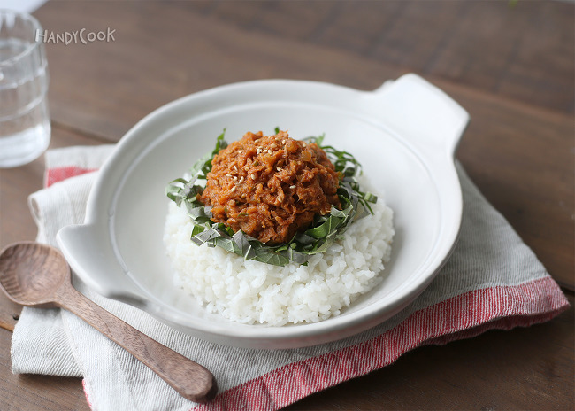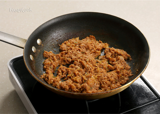 5. 참치를 넣고 2분간 더 볶은 뒤 양념을 넣고 볶아가며 바짝 조린 다음 불을 끈다.