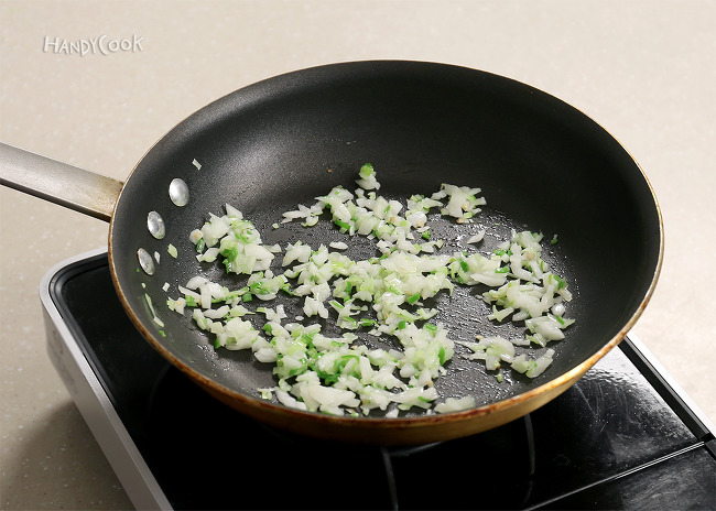 4. 중불로 달군 팬에 식용유를 약간 두른 뒤 양파, 대파, 청양고추를 넣고 1분간 볶는다.