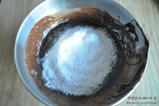 이제 체친 박력분과 코코아 가루를 넣고 살살 섞어줍니다