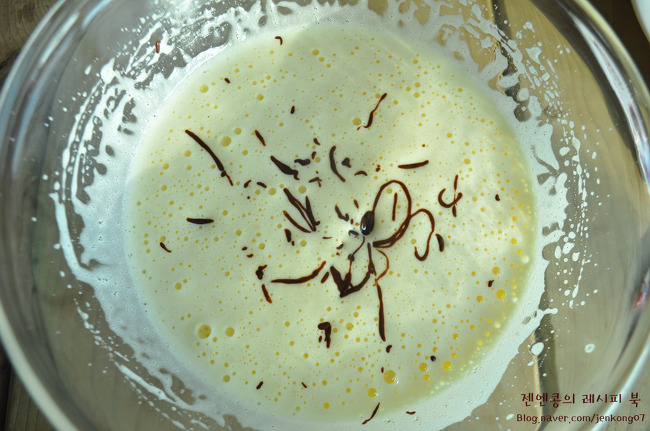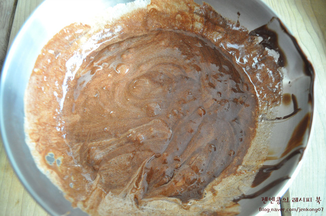 이제 녹인 초콜릿을 넣고 스패출러로 뒤적뒤적 잘 섞어주세요
