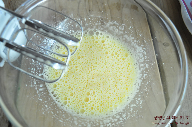 그리고 설탕을 2~3번에 나눠서 넣어가며 핸드믹서로 뽀얗게 거품을 내주세요