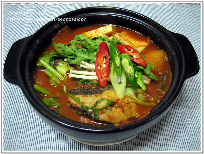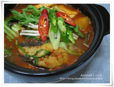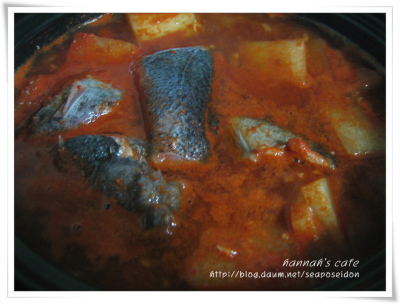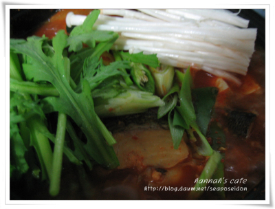 마지막으로 쑥갓과 팽이버섯, 파를 넣고 김 쐐주면 끝. 꽤 먹음직스럽습니다. 때에 따라 고추장을 넣고 안넣기도 하지만 조금 짙은 맛이 먹고싶어서 고추장을 풀었습니다. 역시 우럭 매운탕은 맛있단 말이죠. 생선자체가 기름기가 있어서 고소하기도하고 살도 탄력있어서 괜찮고. 한마리를 뚝딱했더니 아주 행복해졌습니다 ㅎㅎ