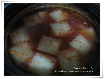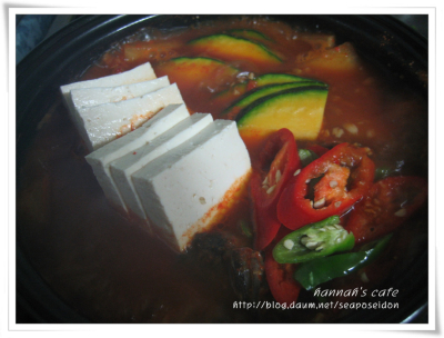 양념장을 넣은 국물이 팔팔 끓어오르면 우럭을 넣고 4~5분 후에 두부와 호박 고추를 넣고 한번 펄펄 끓여줍니다.