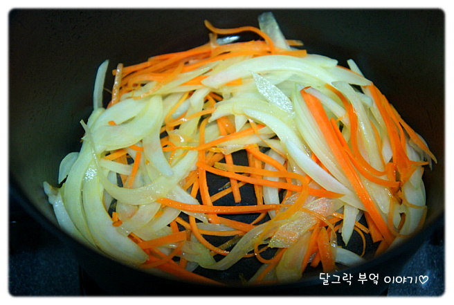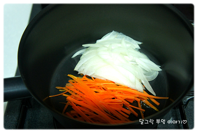 팬에 기름을 약간만 두르고 채썬 양파와 당근을 먼저 볶다가,