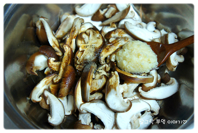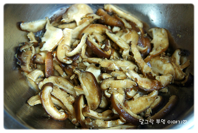 슬라이스한 표고버섯에 양조간장, 다진마늘, 올리고당, 참기름,후추를 넣고