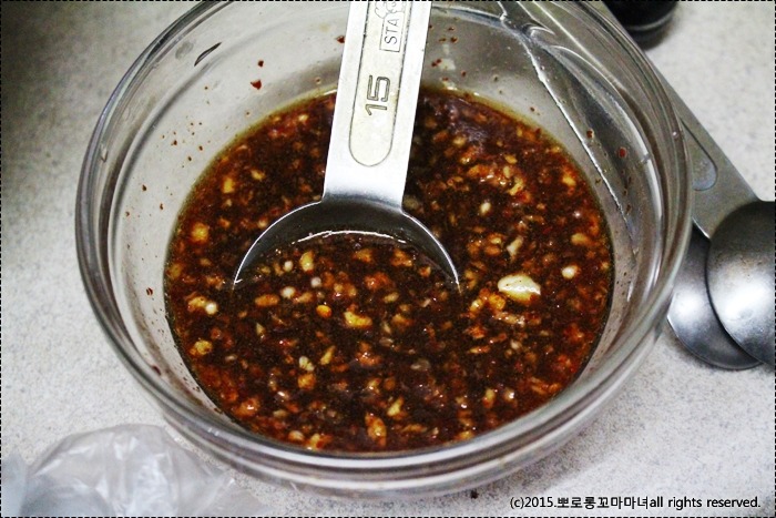 양념 : 간장 3큰술, 올리고당 2큰술, 매실청 1큰술, 참기름 1큰술, 다진마늘 1큰술, 생강가루 두번 톡톡, 고추가루 1-2큰술