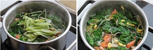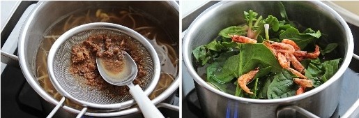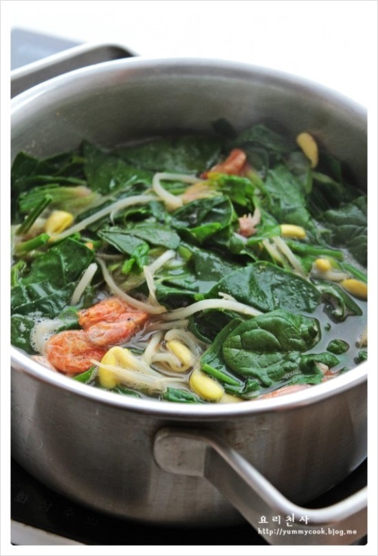 시금치와 다진마늘, 마른새우 약간을 넣고 끓여준다
