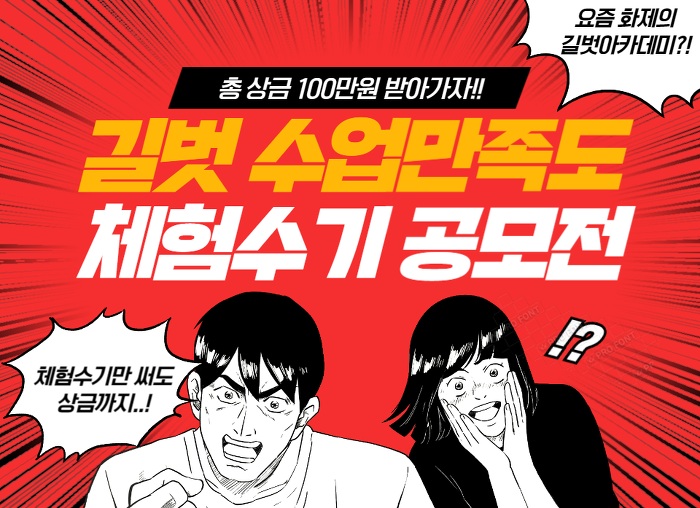 여러분이 경험한 길벗의 장점과 특히 학원 만족과 함께 성적향상을 경험한 학생들의 솔직한 수업만족도 체험수기를 공모합니다.