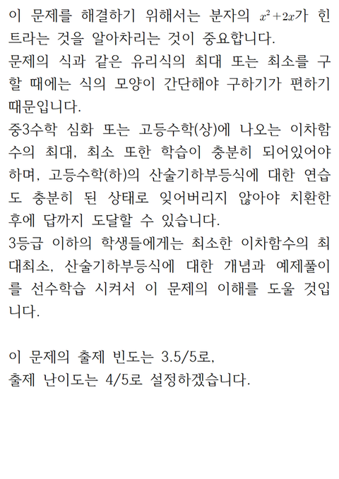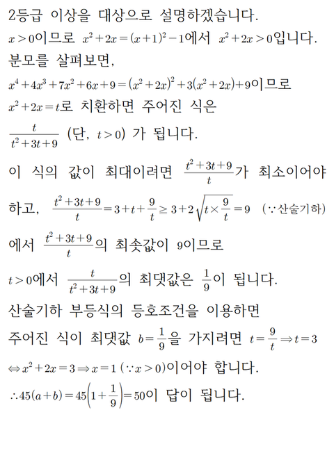 분자를 치환하여 분모의 차수를 줄이고 그 후에 산술기하평균을 이용하여 문제를 풀어냅니다.