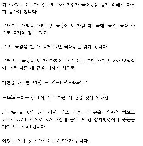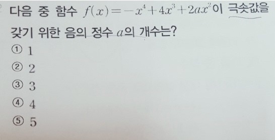 최고차항의 계수가 음수인 사차함수가 극소값을 갖기 위해서 다음과 같아야 합니다.