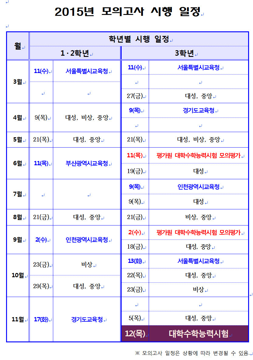 2015년 모의고사 일정표 작성자레오(조-샘)|작성시간15.02.15|조회수207 목록 댓글 0 글자크기 작게가 글자크기 크게가 다음검색 현재 게시글 추가 기능 열기 북마크 공유하기 신고 센터로 신고 댓글 댓글 0 댓글쓰기 답글쓰기 댓글 리스트