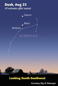 Step outside as the stars come out, look southwest, and you’ll see an eye-catching pattern. For the next few days (August 17–22), bright orange Mars shines to the right of Saturn and the reddish star Antares. The three form a tall triangle that changes every night