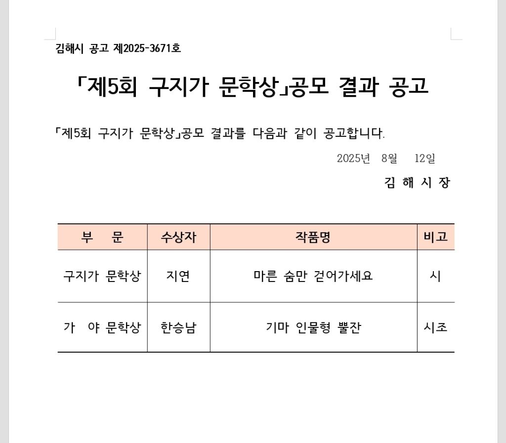제 5회 구지가문학상 응모결과 수상자 발표 작성자이정심|작성시간25.08.12|조회수992 목록 댓글 3 글자크기 작게가 글자크기 크게가 다음검색 현재 게시글 추가 기능 열기 북마크 공유하기 신고 센터로 신고 댓글 댓글 3 댓글쓰기 답글쓰기 댓글 리스트 작성자최삼용(시) | 작성시간 25.08.12 수고 많았습니다영광의 당선작 어서 보고 싶네요^^ 작성자하성자 | 작성시간 25.08.13 수고 많으셨습니다. 작성자김영미(아동) | 작성시간 25.08.13 수고하셨습니다 댓글 전체보기