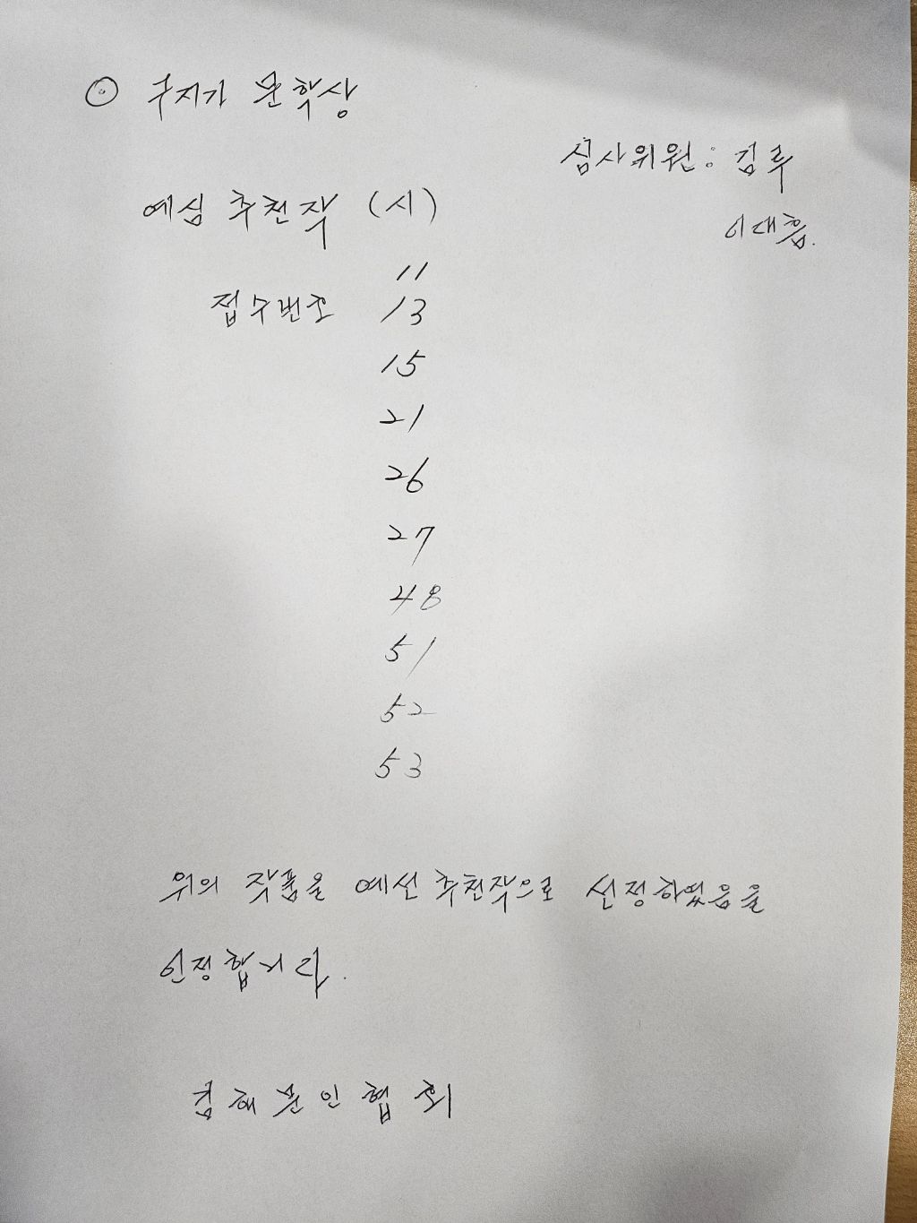 구지가문학상 예심 심사사진 작성자이정심|작성시간25.08.20|조회수107 목록 댓글 0 글자크기 작게가 글자크기 크게가 예심 7월 10일장소. 시청 제2청사 심사위원 이대흠시인, 김루시인, 옥영숙시조시인. 다음검색 현재 게시글 추가 기능 열기 북마크 공유하기 신고 센터로 신고 댓글 댓글 0 댓글쓰기 답글쓰기 댓글 리스트
