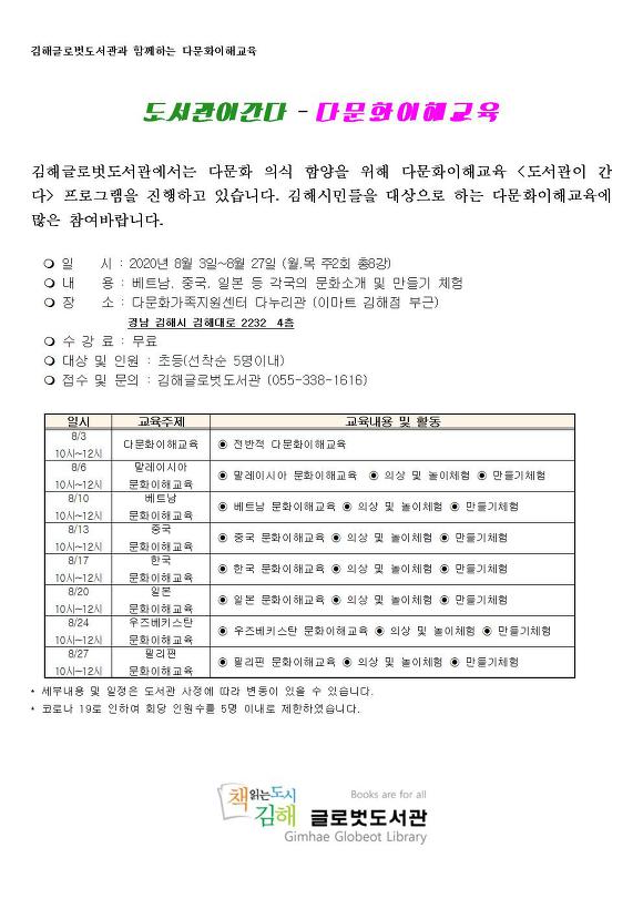 그동안 김해시내 작은도서관으로 찾아가 진행되었던 다문화이해교육 프로그램을 코로나 19로 인하여 이번에는 다문화가족지원센터 다누리관에서 진행하게 되었습니다. 인원도 대폭 축소하여 5명으로 제한하였습니다. 코로나 19로 인한점 양해 부탁드립니다.