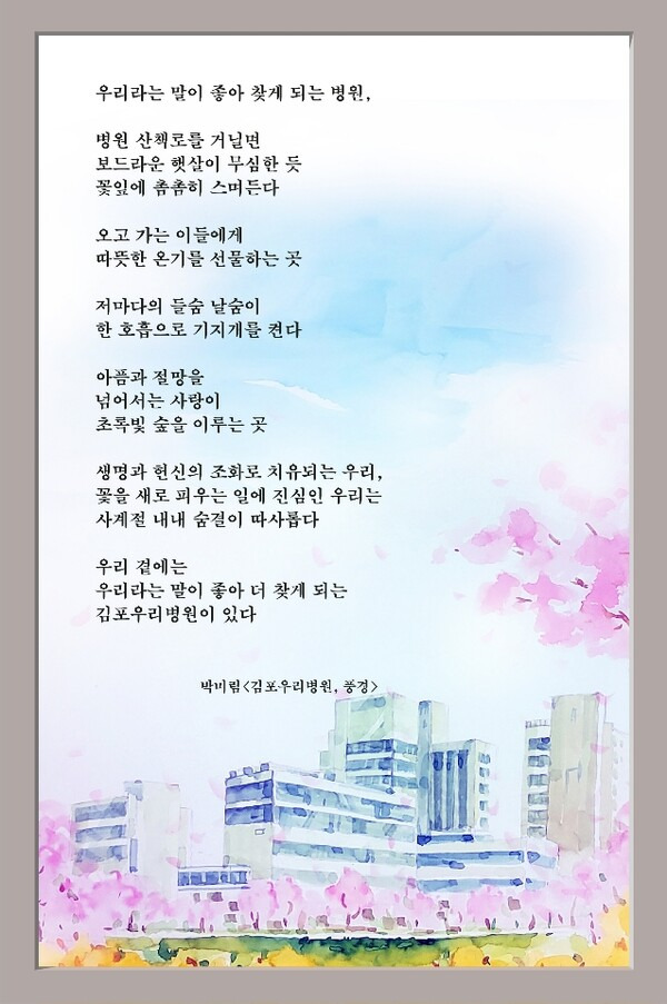 김포우리병원, 풍경/ 박미림 작성자박미림*|작성시간26.02.27|조회수22 목록 댓글 0 글자크기 작게가 글자크기 크게가 https://www.igimpo.com/news/articleView.html?idxno=91324[문화엿보기] 김포우리병원, ‘시가 있는 풍경’ - 김포신문질병 치료를 위해 병원으로 향하는 길은 결코 즐겁지 않다. 아니 병원은 늘 두려움에 가까운 공간이다. 아프고 지친 얼굴로 대기실에 앉아 있는 환자들과 그 곁에서 걱정을 삼키는 보호자들 그www.igimpo.com 다음검색 현재 게시글 추가 기능 열기 북마크 공유하기 신고 센터로 신고 댓글 댓글 0 댓글쓰기 답글쓰기 댓글 리스트