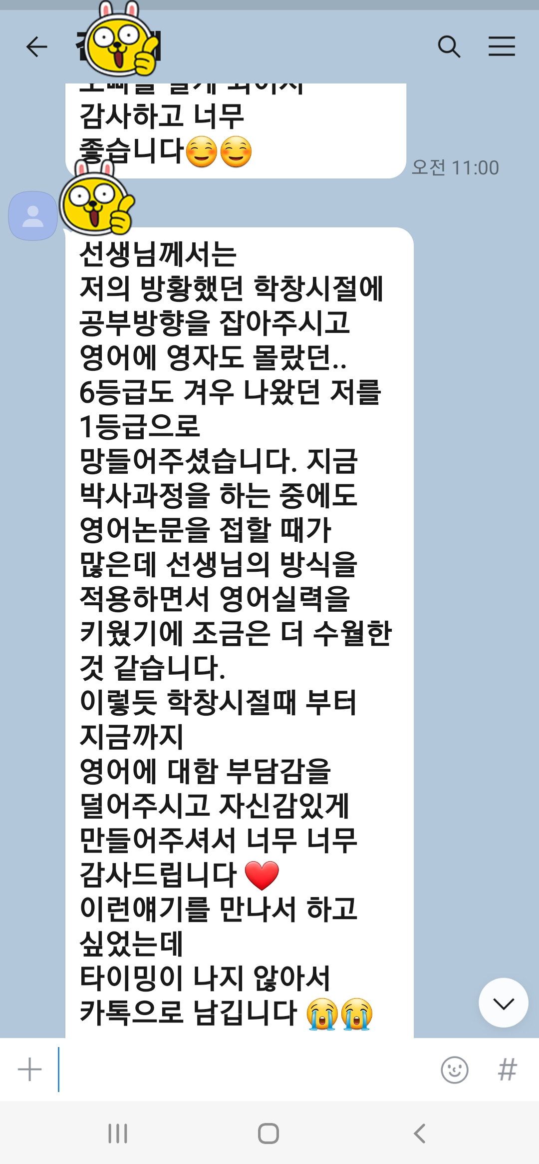 끝으로 제 오랜 제자가 바로 엇그제 보내온 카톡 문자를 통해서 예를 갈음하고자 합니다.