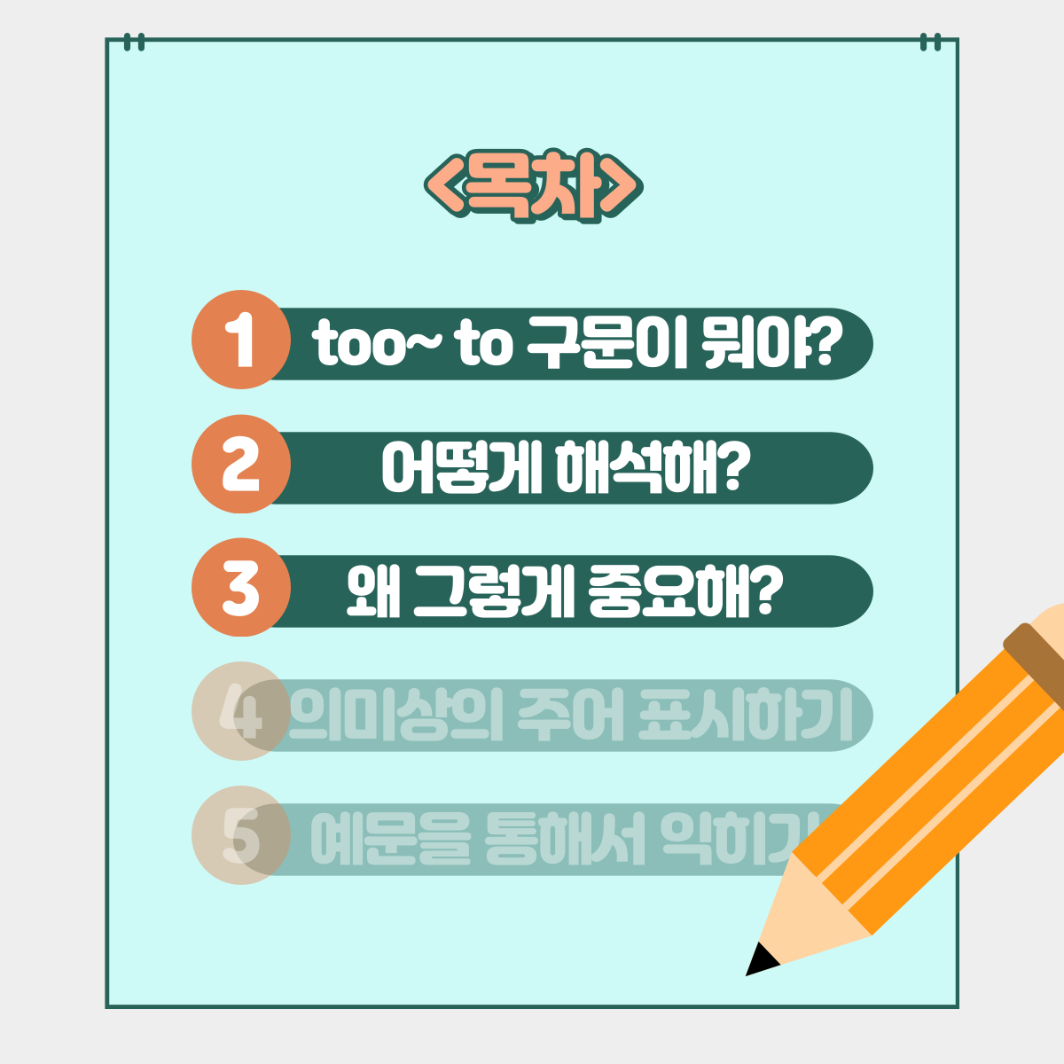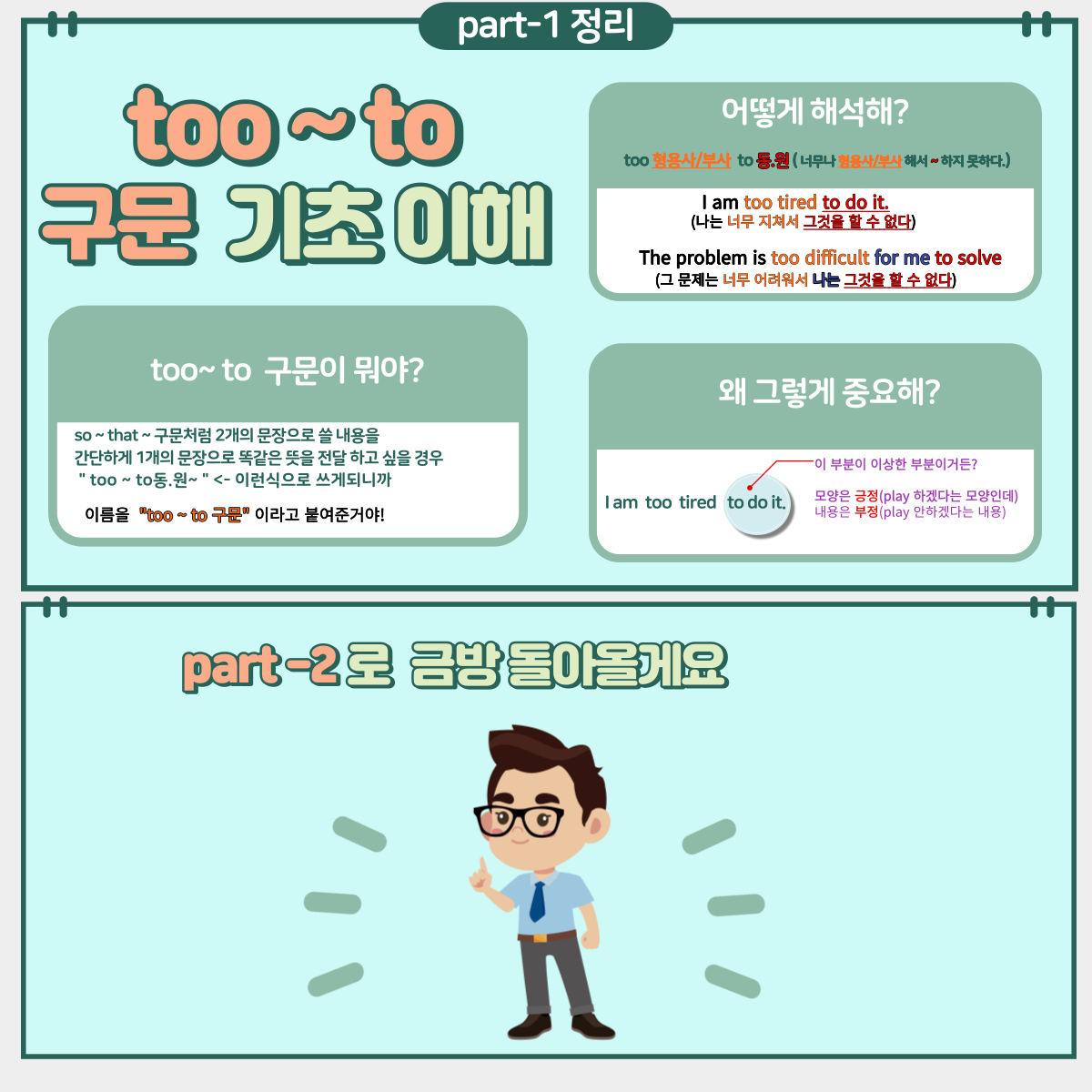 Too- to 구문 part-1( 눈으로 읽기만 해도 이해가 되는 문법) 작성자Gindol|작성시간23.07.15|조회수29 목록 댓글 0 글자크기 작게가 글자크기 크게가 다음검색 현재 게시글 추가 기능 열기 북마크 공유하기 신고 센터로 신고 댓글 댓글 0 댓글쓰기 답글쓰기 댓글 리스트