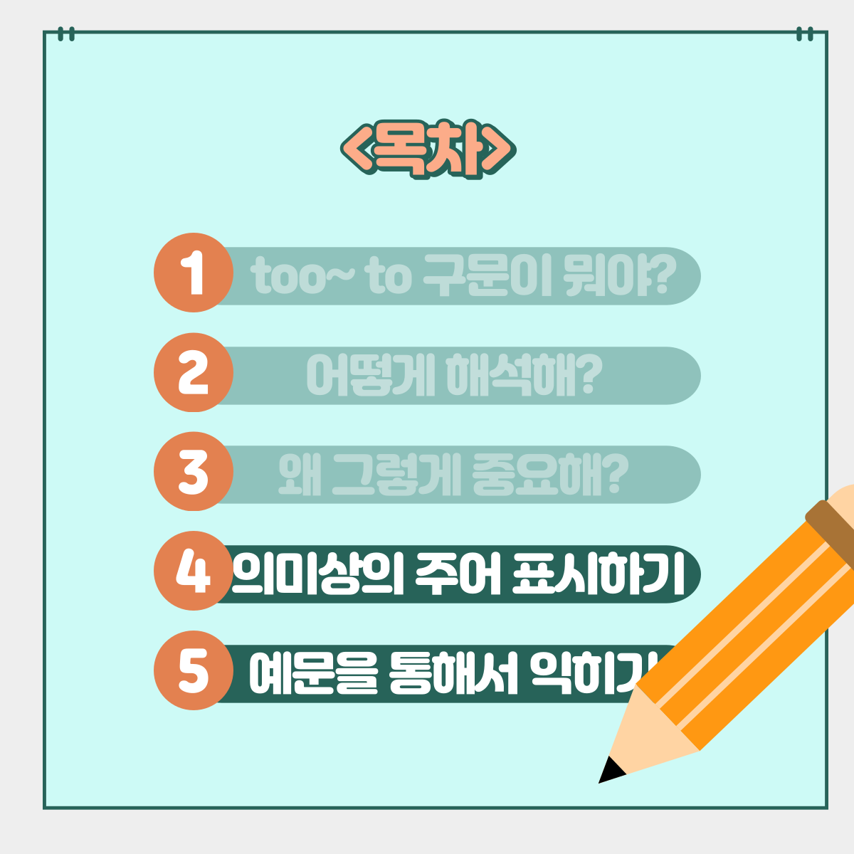 Too- to 구문 part-2( 눈으로 읽기만 해도 이해가 되는 문법) 작성자Gindol|작성시간23.08.07|조회수28 목록 댓글 0 글자크기 작게가 글자크기 크게가 다음검색 현재 게시글 추가 기능 열기 북마크 공유하기 신고 센터로 신고 댓글 댓글 0 댓글쓰기 답글쓰기 댓글 리스트