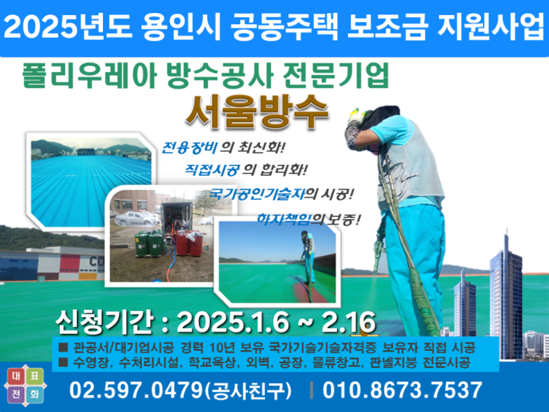 안타깝게도 개인적으로 용인시 공동주택 보조금 지원사업 신청 및 관련일을 수행할 수 없어서 폴리우레아 방수공사 전문기업 서울방수(대표 안세근)와 협력하고 있습니다.
