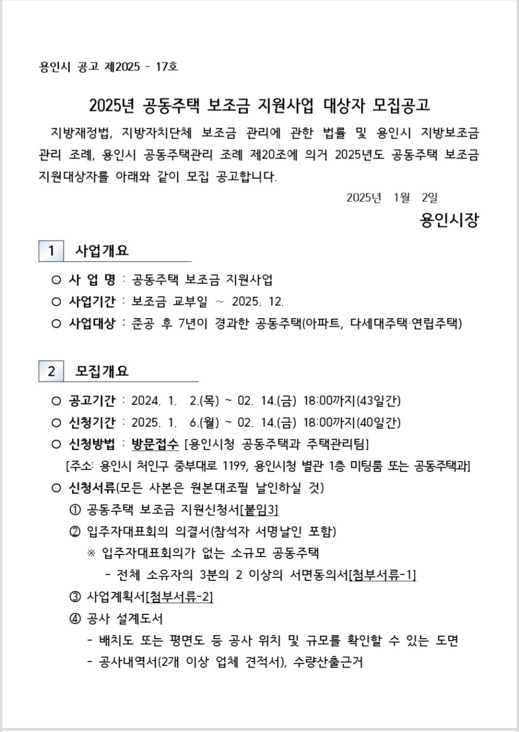 '2025년도 용인시 공동주택 보조금 지원사업 대상자 모집공고