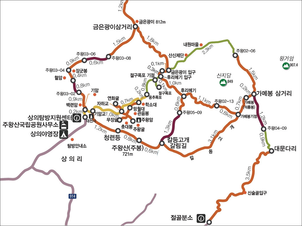 상의[주차](250m) - 주봉(726m) - 후리메기입구(340m) -(주방천계곡 3,2,1폭포 경유 4.7)- 상의[주차]