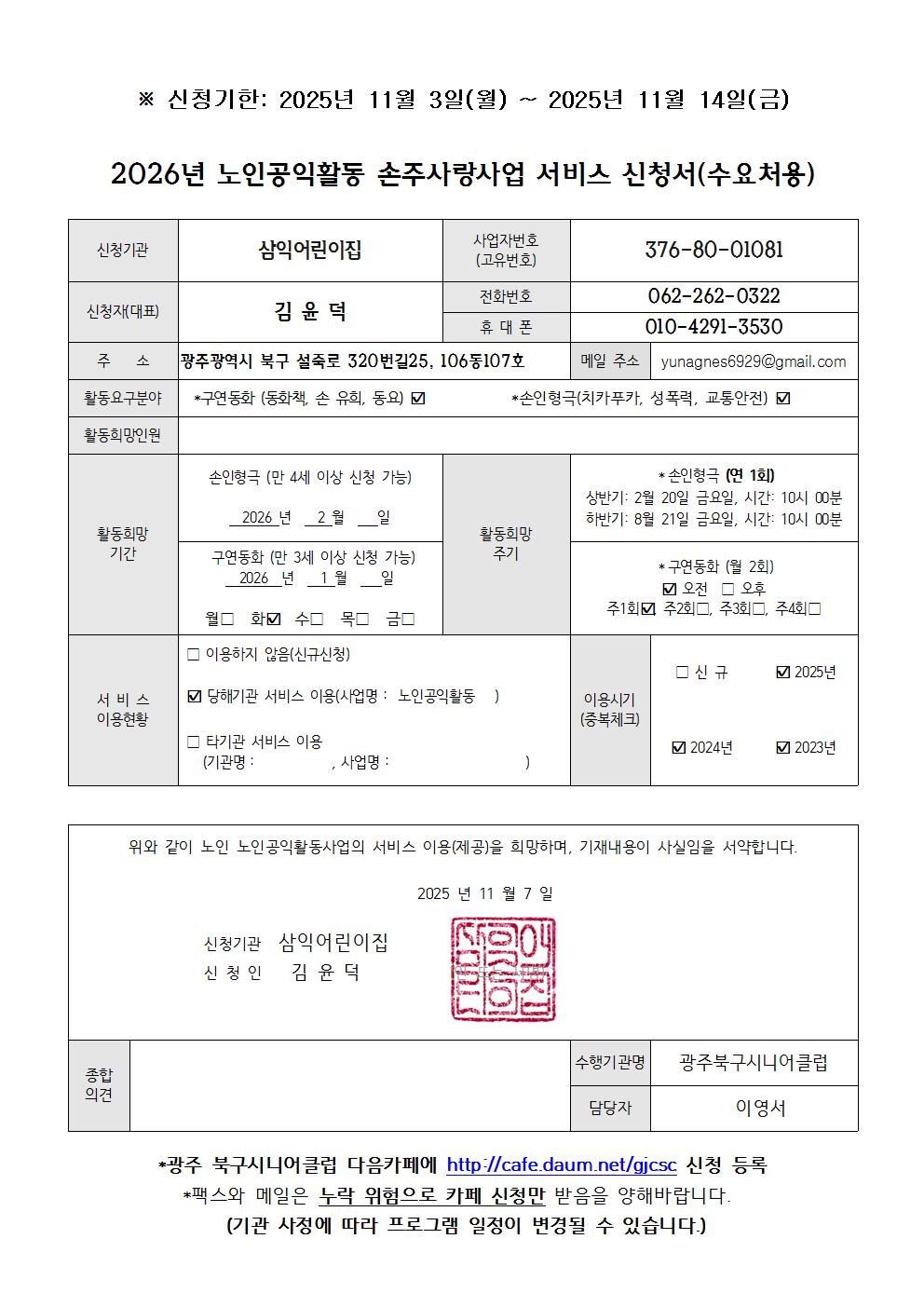 2026년 삼익어린이집 신청서 작성자삼익|작성시간25.11.10|조회수7 목록 댓글 0 글자크기 작게가 글자크기 크게가 다음검색 현재 게시글 추가 기능 열기 북마크 공유하기 신고 센터로 신고 댓글 댓글 0 댓글쓰기 답글쓰기 댓글 리스트