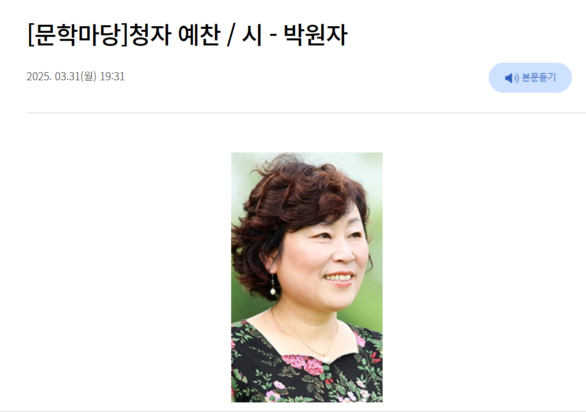 광주매일 신문 -문학마당 -청자 예찬 / 시 박원자 작성자박원자|작성시간25.04.02|조회수65 목록 댓글 2 글자크기 작게가 글자크기 크게가 http://m.kjdaily.com/article.php?aid=1743417060653498202&page=1 다음검색 현재 게시글 추가 기능 열기 북마크 공유하기 신고 센터로 신고 댓글 댓글 2 댓글쓰기 답글쓰기 댓글 리스트 작성자노래천사 | 작성시간 25.04.08 박원자 시인님 축하드립니다.^^ 답댓글 작성자박원자 작성자 본인 여부 작성자 | 작성시간 25.04.09 감사합니다. 댓글 전체보기