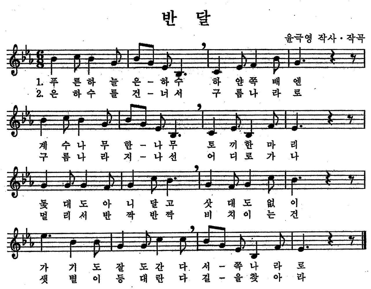 ‘푸른 하늘 은하수 하얀 쪽배엔 / 계수나무 한 나무 토끼 한 마리…’로 시작하는 <반달>은 윤극영(尹克榮·1903~1988)이 1923년에 작사((作詞)·작곡(作曲)한 우리나라 최초의 창작동요다.