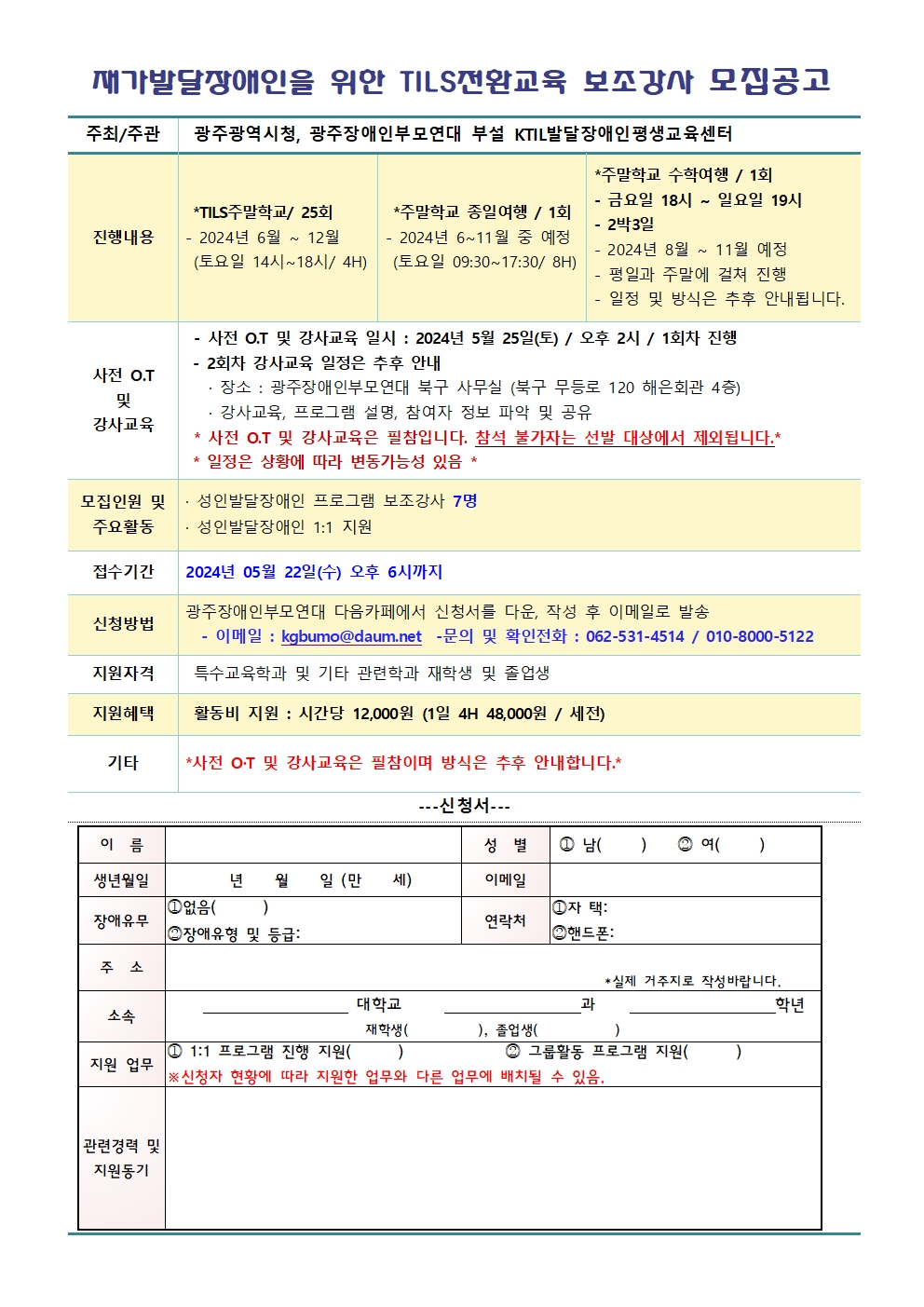 ◆2024년도 TILS 전환교육 주말학교 보조강사 모집◆ 작성자광주장애인부모연대|작성시간24.05.03|조회수2,592 목록 댓글 0 글자크기 작게가 글자크기 크게가 2024년도 재가발달 장애인을 위한 TILS 전환교육 주말학교 보조강사를 모집합니다. 많은 신청 바랍니다^^! 신청서는 아래 한글파일을 다운받아서 작성해주세요^^2024년 보조강사 모집공지문 및 신청서.hwp74.50KB 첨부파일첨부된 파일이 2개 있습니다. jpg 파일 2024년 보조강사 모집공지문 및 신청서001.jpg 다운로드 hwp 파일 2024년 보조강사 모집공지문 및 신청서.hwp 다운로드 다음검색 현재 게시글 추가 기능 열기 북마크 공유하기 신고 센터로 신고 댓글 댓글 0 댓글쓰기 답글쓰기 댓글 리스트
