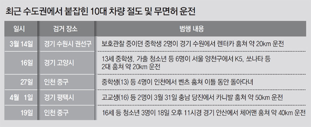 경찰에 따르면 3월 수도권에서만 최소 청소년 14명이 삼삼오오 차량을 훔쳐 무면허 운전을 했다. 14일 경기 수원시 권선구에선 보호관찰 중이던 전모 군(14)과 김모 군(13)이 렌터카를 훔쳐 약 20km를 질주하다가 적발됐다. 16일 경기 고양시 일산동구에선 13세 청소년 6명이 서울 양천구 목동에서 훔친 K5와 쏘나타를 몰다가 모두 검거됐다.