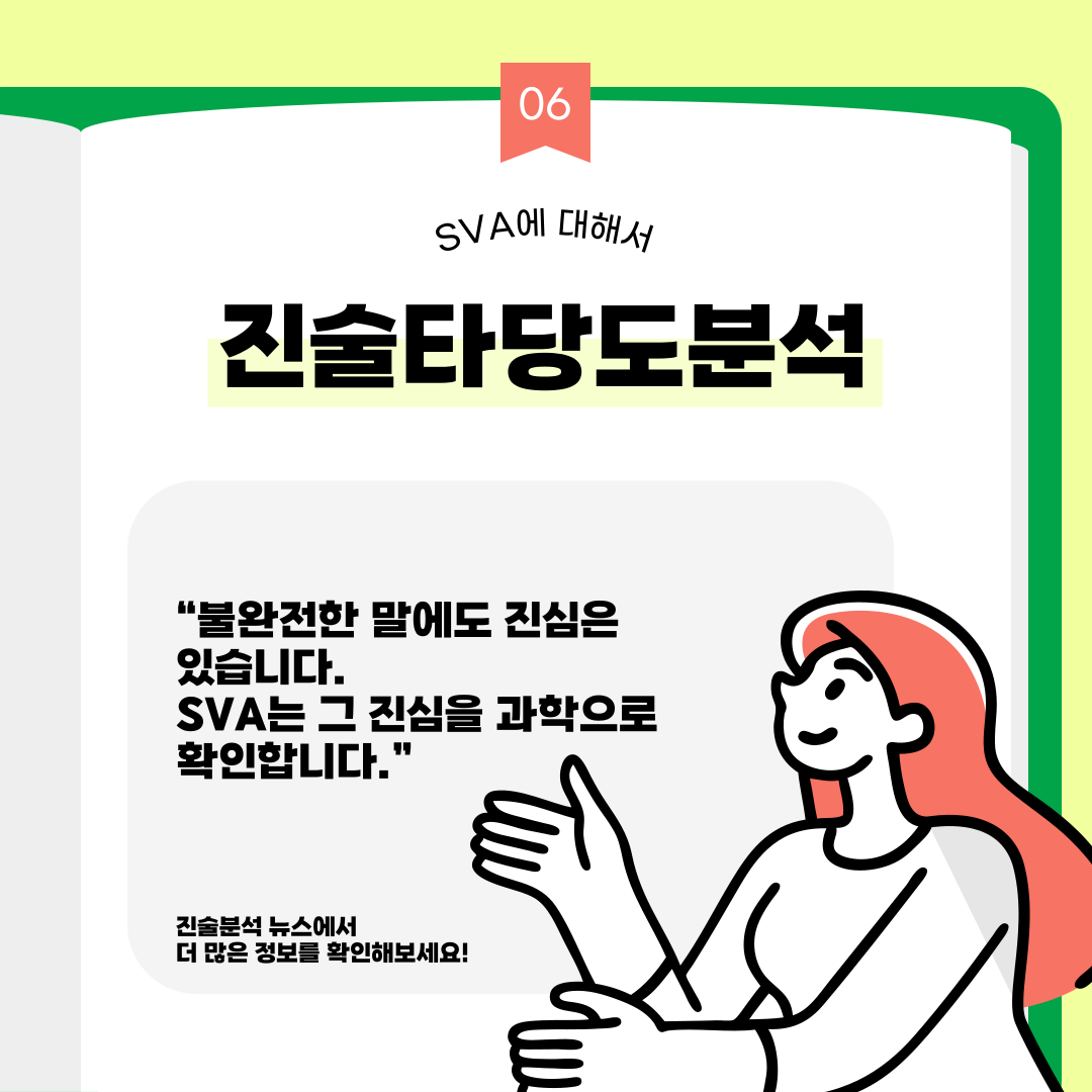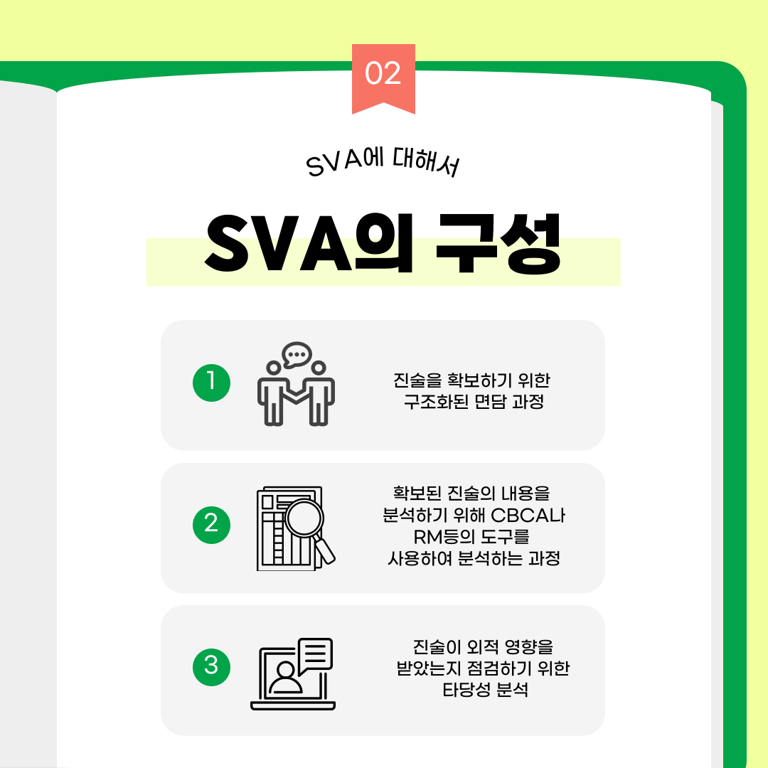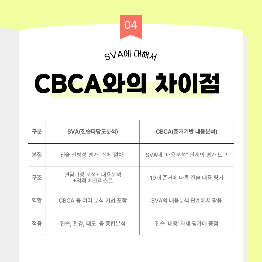 [카드뉴스 : 4호] 진술타당성 평가인 SVA에 대해 알아보기 작성자원혜은|작성시간25.08.18|조회수19 목록 댓글 0 글자크기 작게가 글자크기 크게가 출처: DNA 분석만으론 어려운 '참·거짓' 가리는 '진술분석' : 동아사이언스진술분석 절차의 확립: 진술타당도분석(SVA)과학 기술의 틈새 : 진술 신빙성 판단 < 이윤정의 법심리학 카페 < 범죄 전문가들의 사건분석 < 기사본문 - 수사연구 다음검색 현재 게시글 추가 기능 열기 북마크 공유하기 신고 센터로 신고 댓글 댓글 0 댓글쓰기 답글쓰기 댓글 리스트