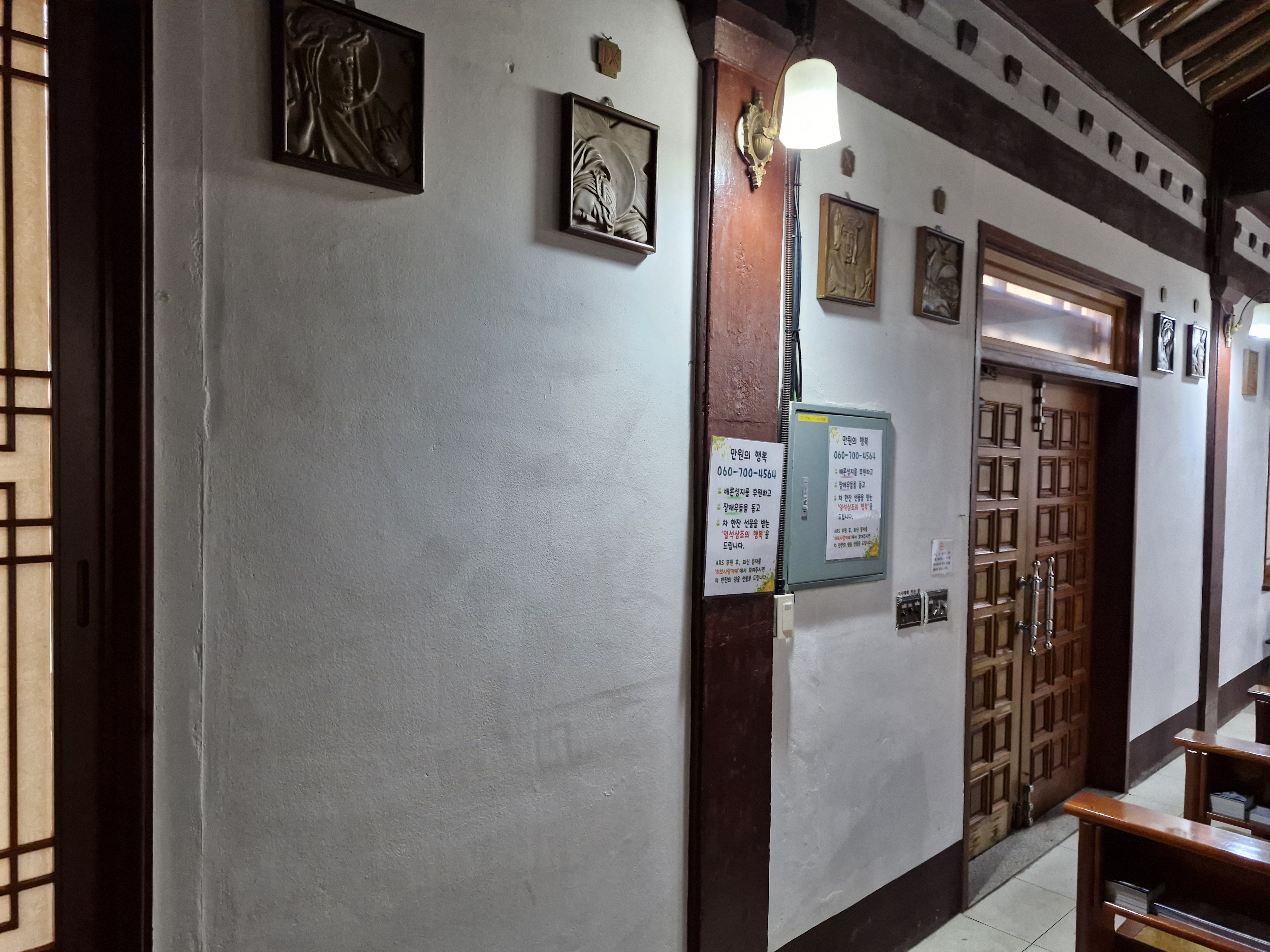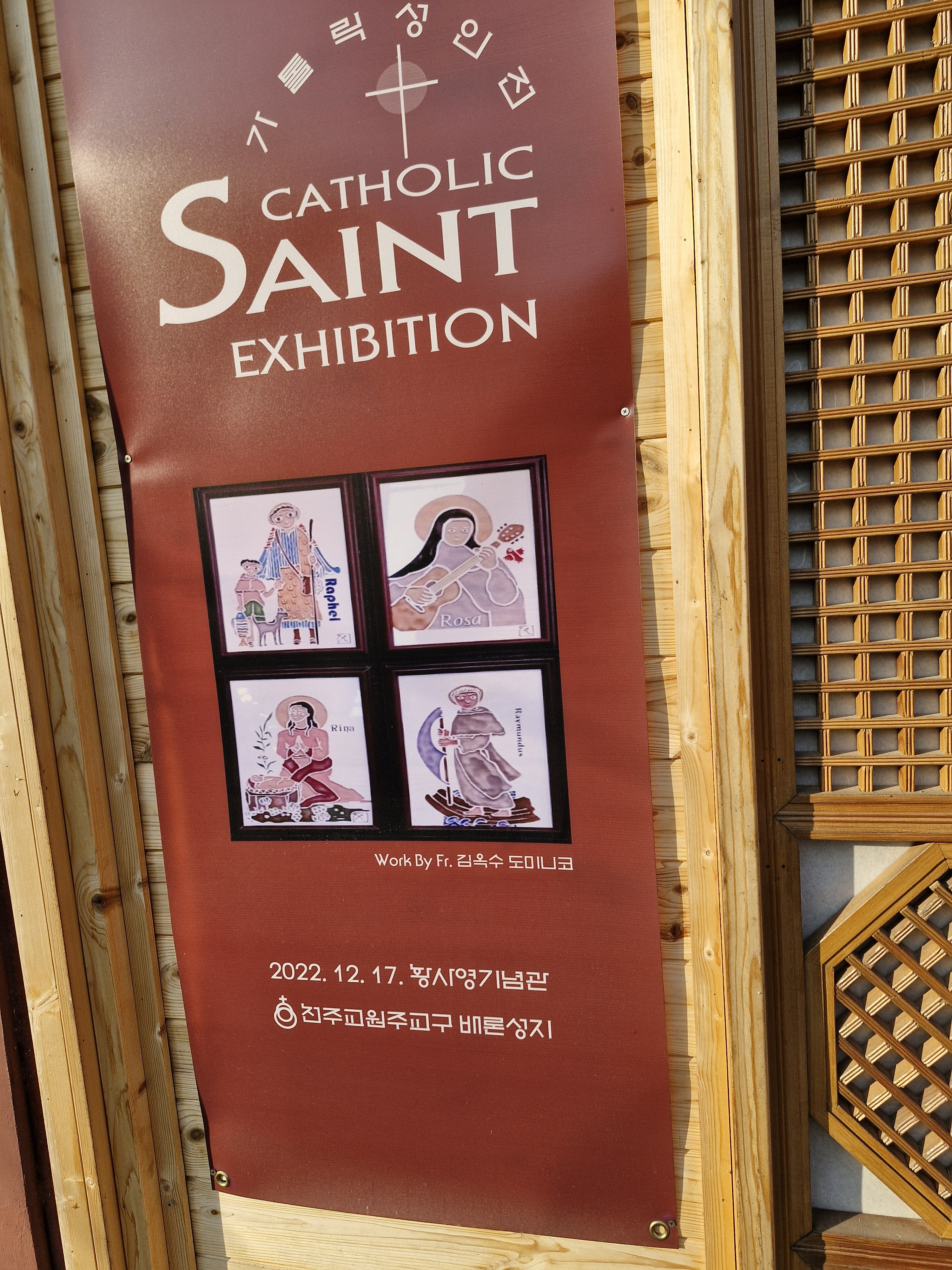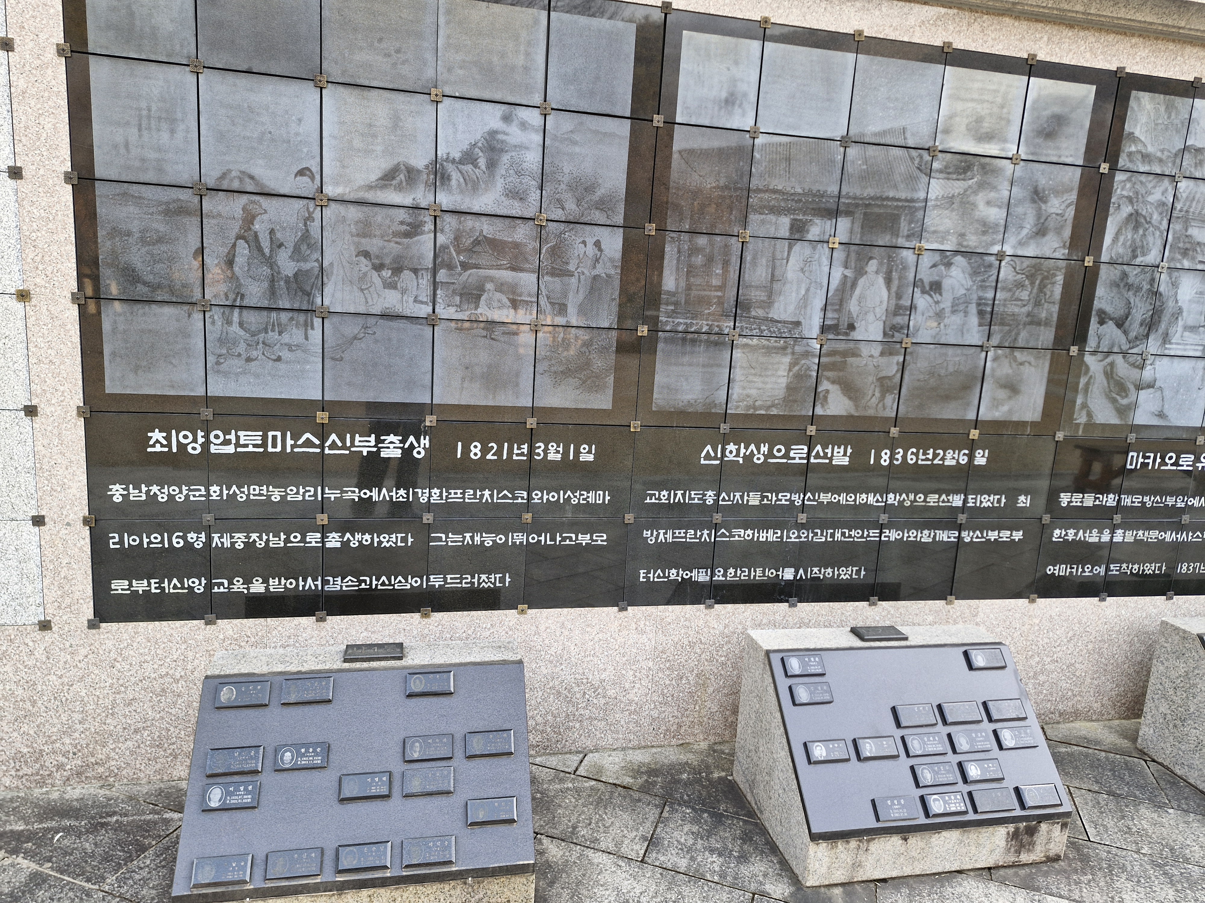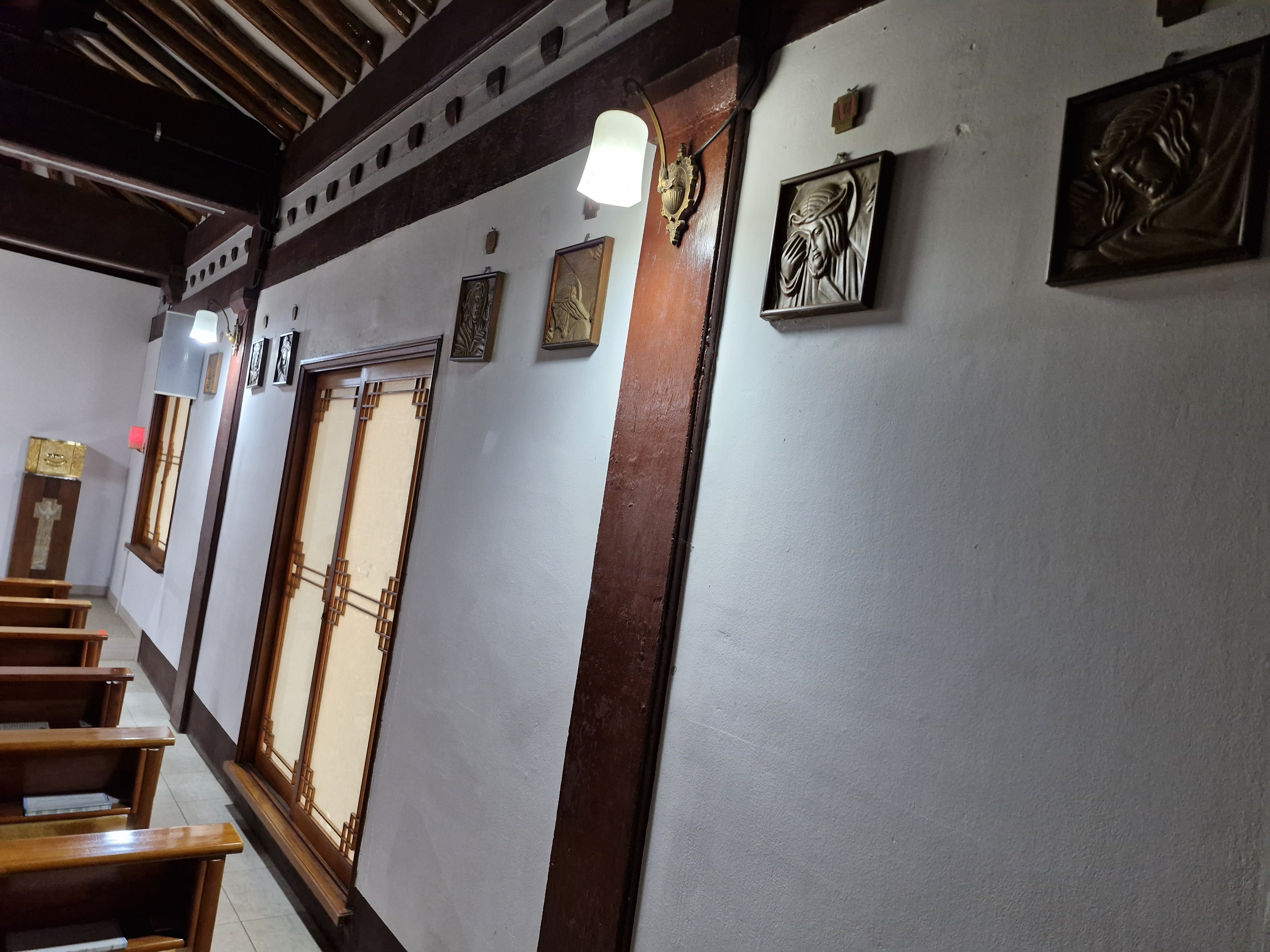 바깥벽에는 그림이 걸렸다. 이 그림은 성신 가톨릭대학교 2015년 개교 160주년 기념일을 맞이하여 이콘 연구소에서 제작하여 기증한 것이다. 그 개교 160주년이 바로 이 배론 신학당이 세워졌던 1855년을 기점으로 한 것이다. 배론 성지와 불가분의 관계가 있기에 그 기념화를 복제해서 건 것 같다. 서울 순례때 성신 가톨릭대학 성당에서 이 그림을 본 것이 기억이 난다.