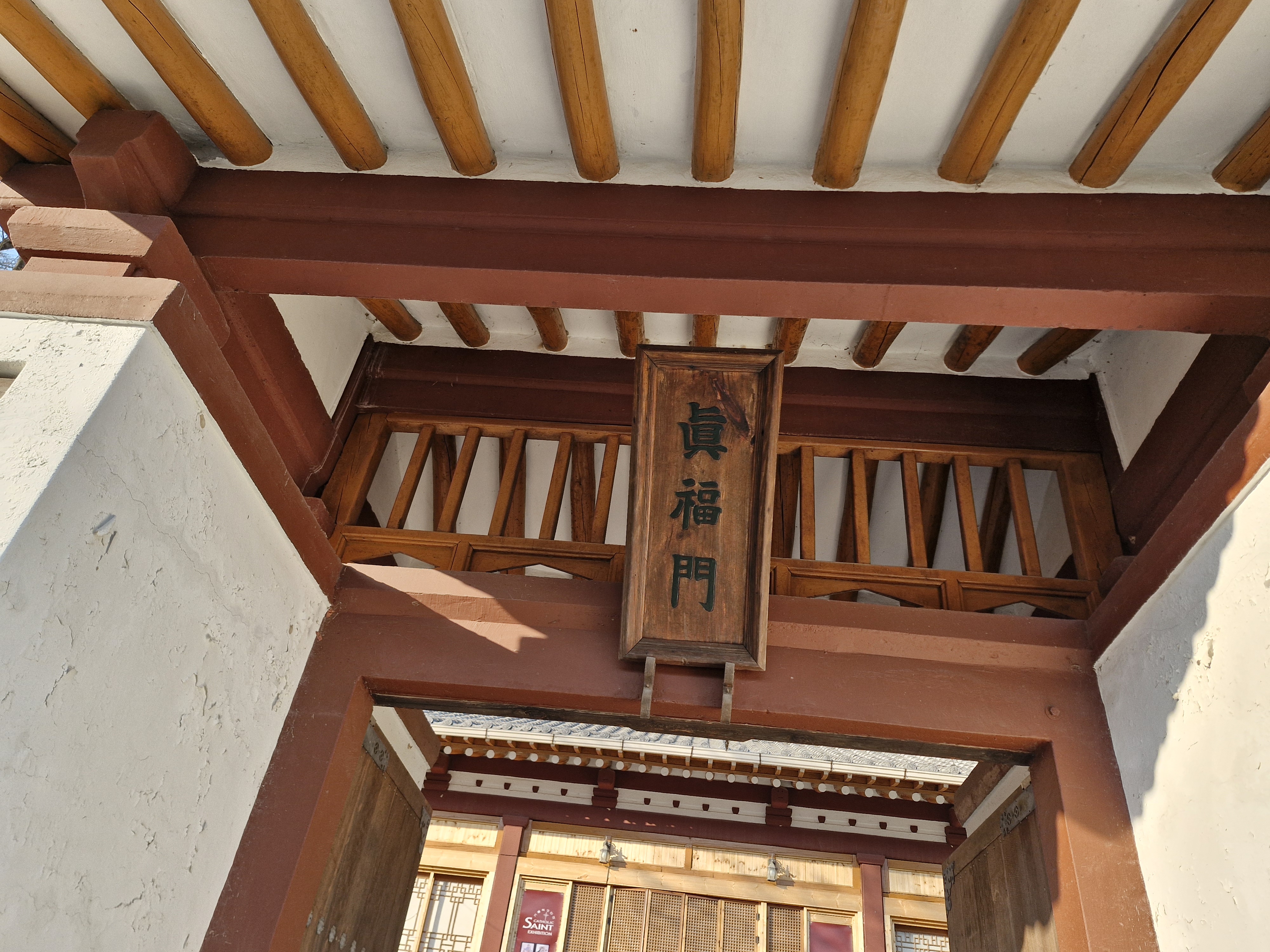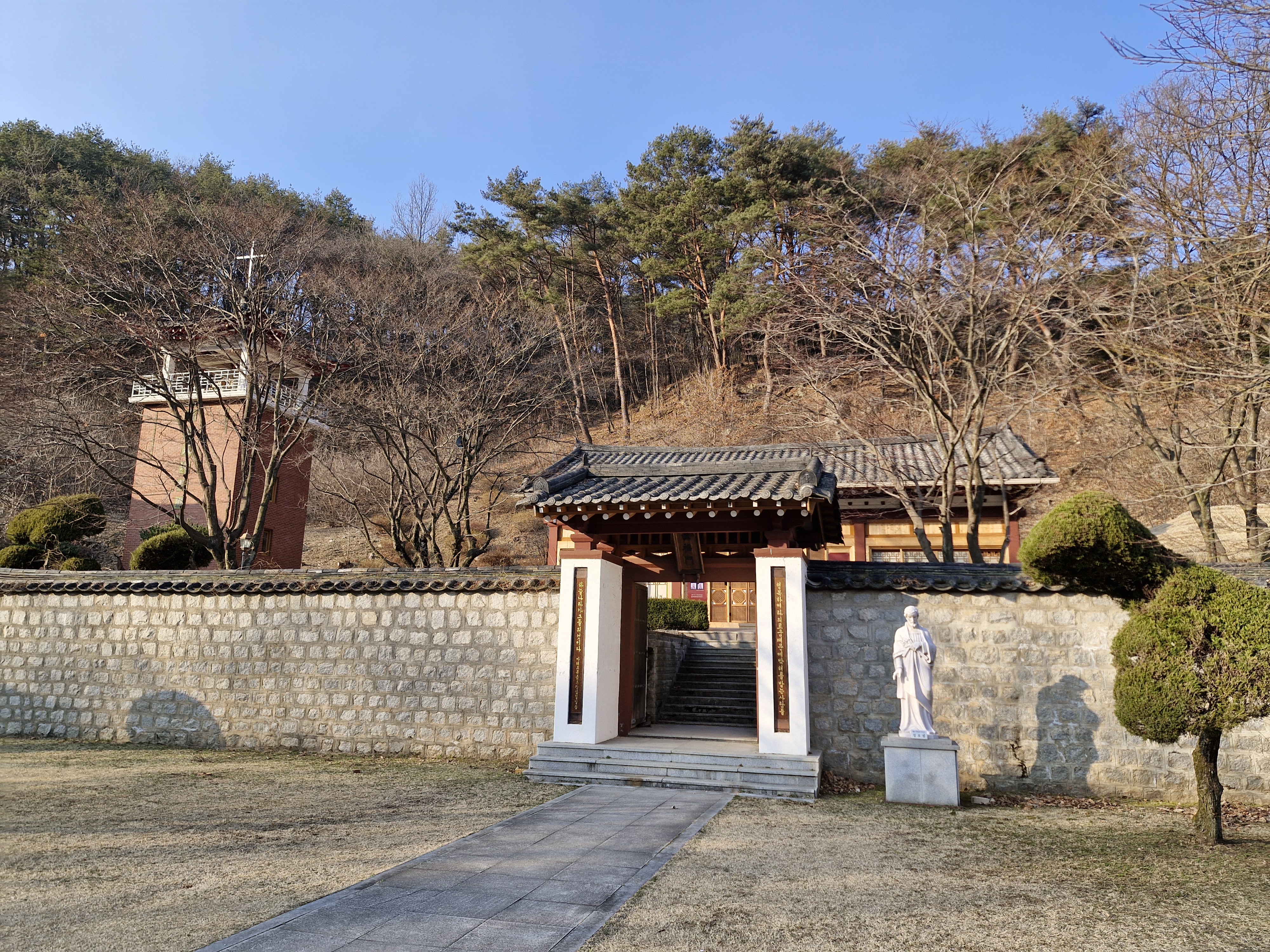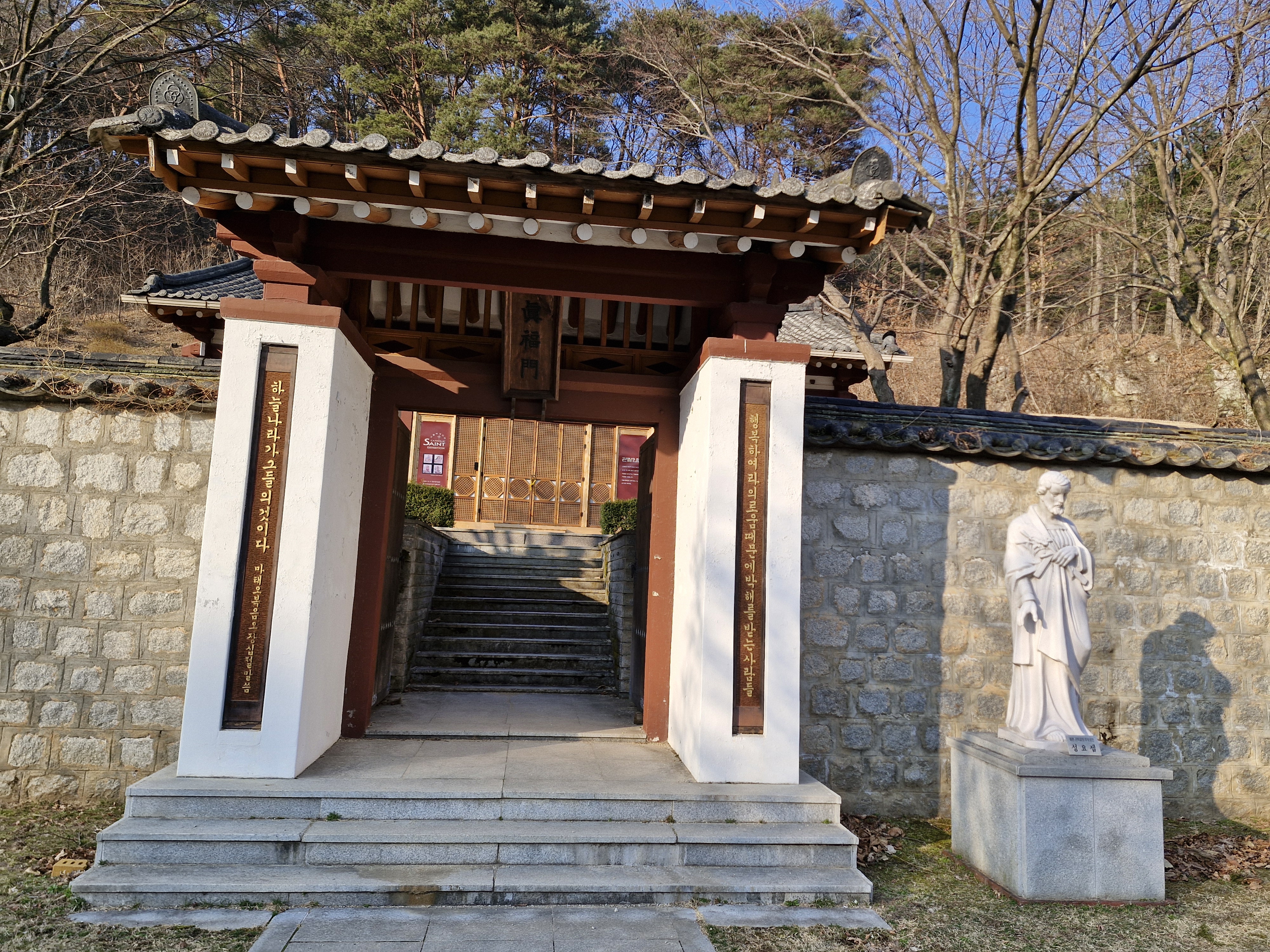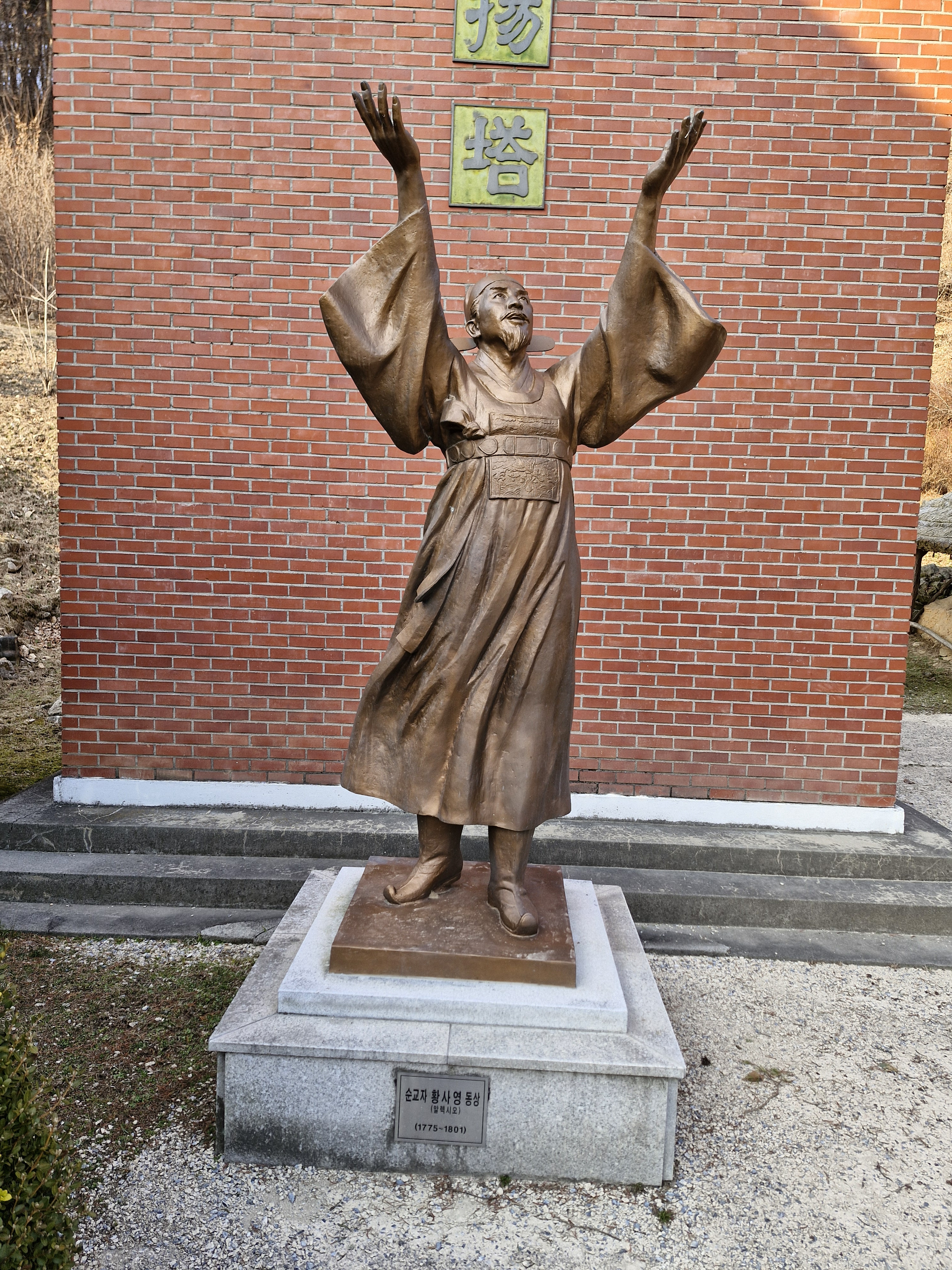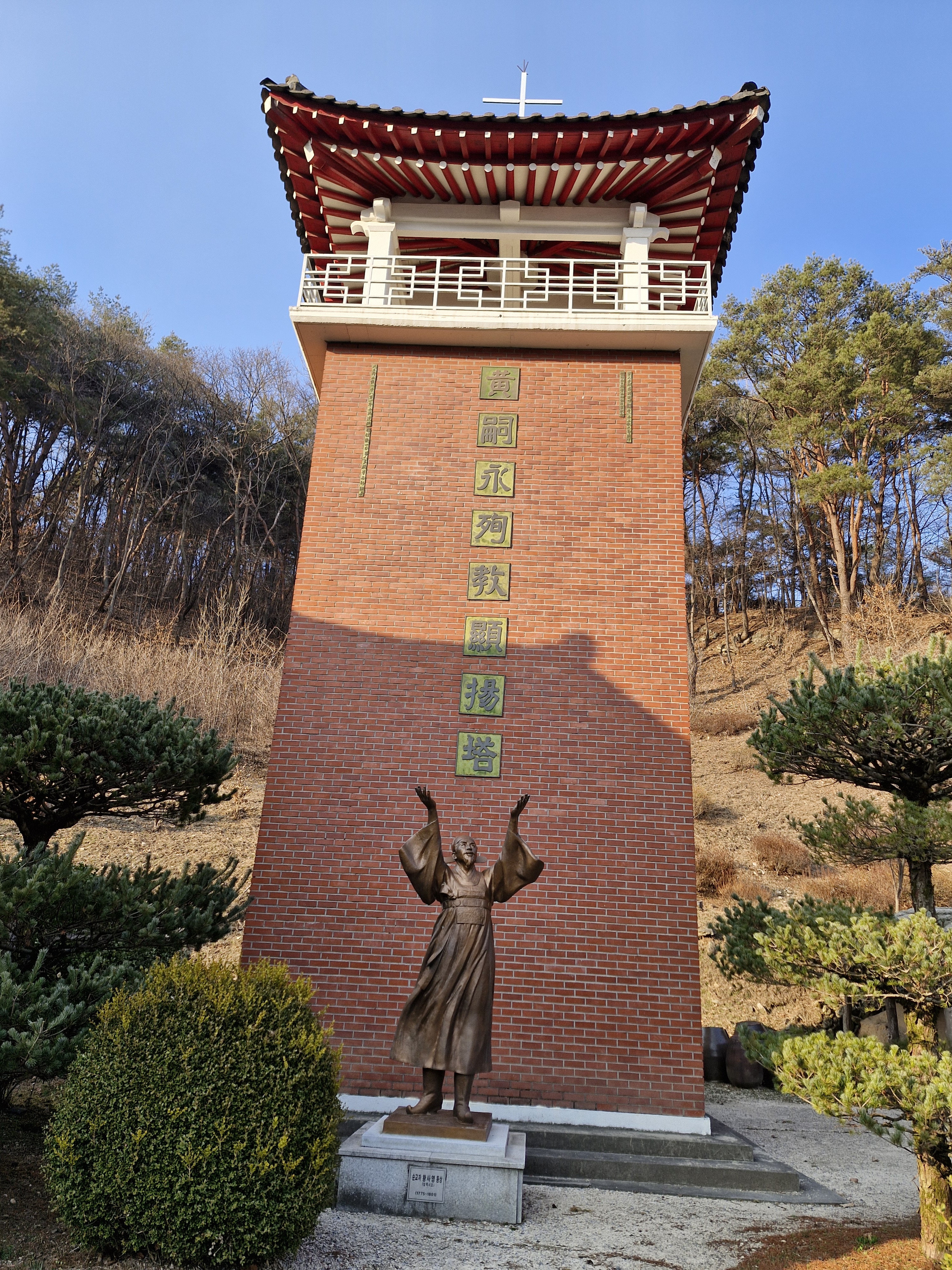 원래 진복문은 원래 황사영 경당에 들어가는 문으로 지은 것이다. 지금은 경당은 없어지고 전시관으로 활용되고 있다. 출입문 옆에 전시 안내 포스터가 붙어있다. 2022년 12월부터 김옥수 도미니코 신부가 제작한 가톨릭 성인전 조각상이 전시 중인데 문은 잠겨 있다. 관리실에 전화로 물어보니 동절기에는 열지 않는다는 대답이다. 그래서 건물 왼쪽에 있는 황사영 순교현양탑만 보고 돌아섰다. 탑 앞에는 영혼이 하늘을 향해 오를 듯한 역동적인 황사영 동상이 있다.