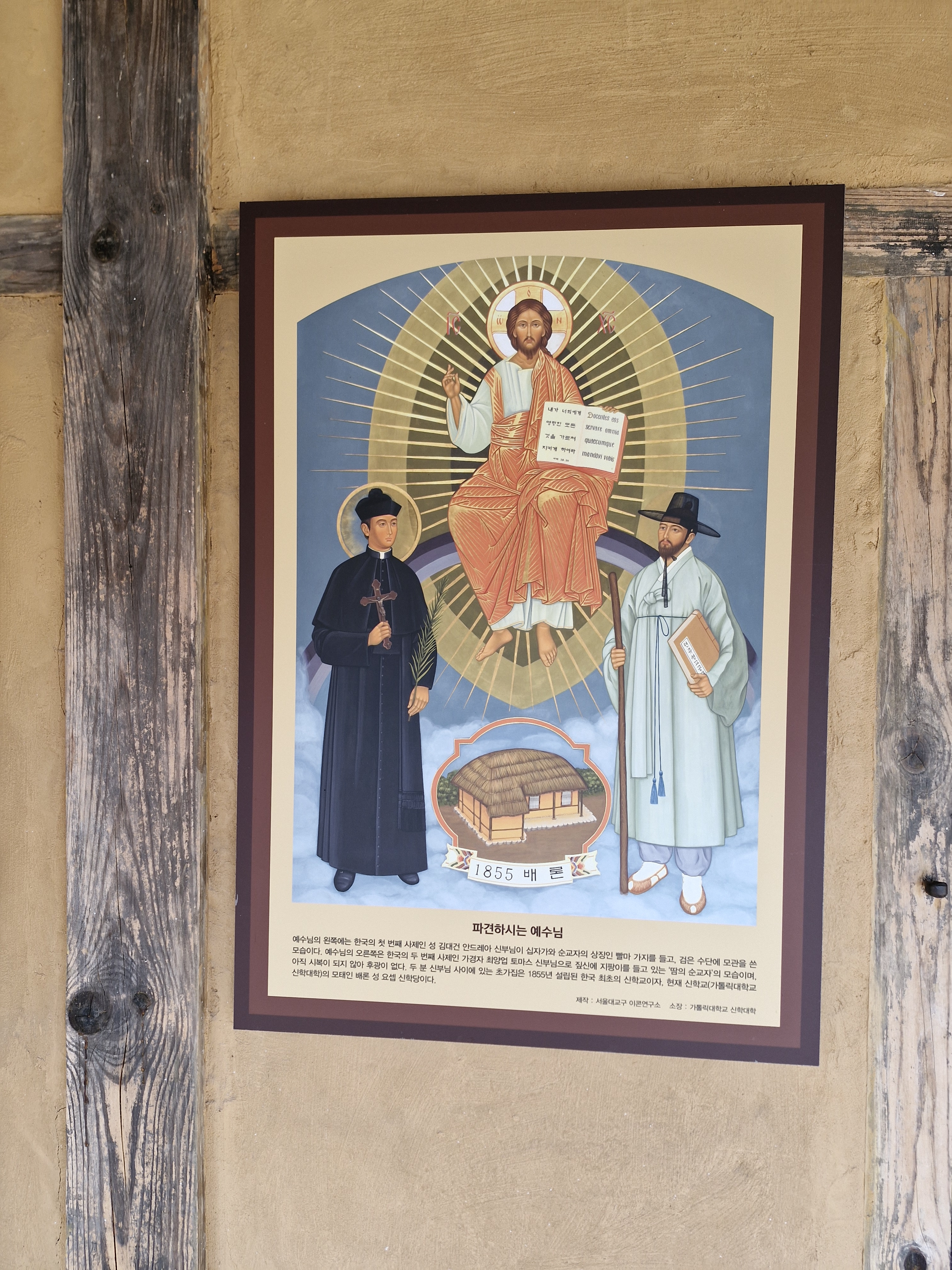 예수님 아래 왼쪽은 검은 수단에 모관을 쓰고 순교의 상징 팔마 가지를 든 김대건 신부님이시고 오른쪽은 지팡이에 교리책을 들고 여행자 차림의 땀의 순교자 최양업 신부님이시다. 아직 시성이 되지 않아 머리 뒤에 후광이 없다. 예수님 발 아래 초가집은 베론 신학당이며 예수님이 들고 계시는 글은 “내가 너희에게 명령한 모든 것을 가르쳐 지키게 하여라”라는 내용이다.
