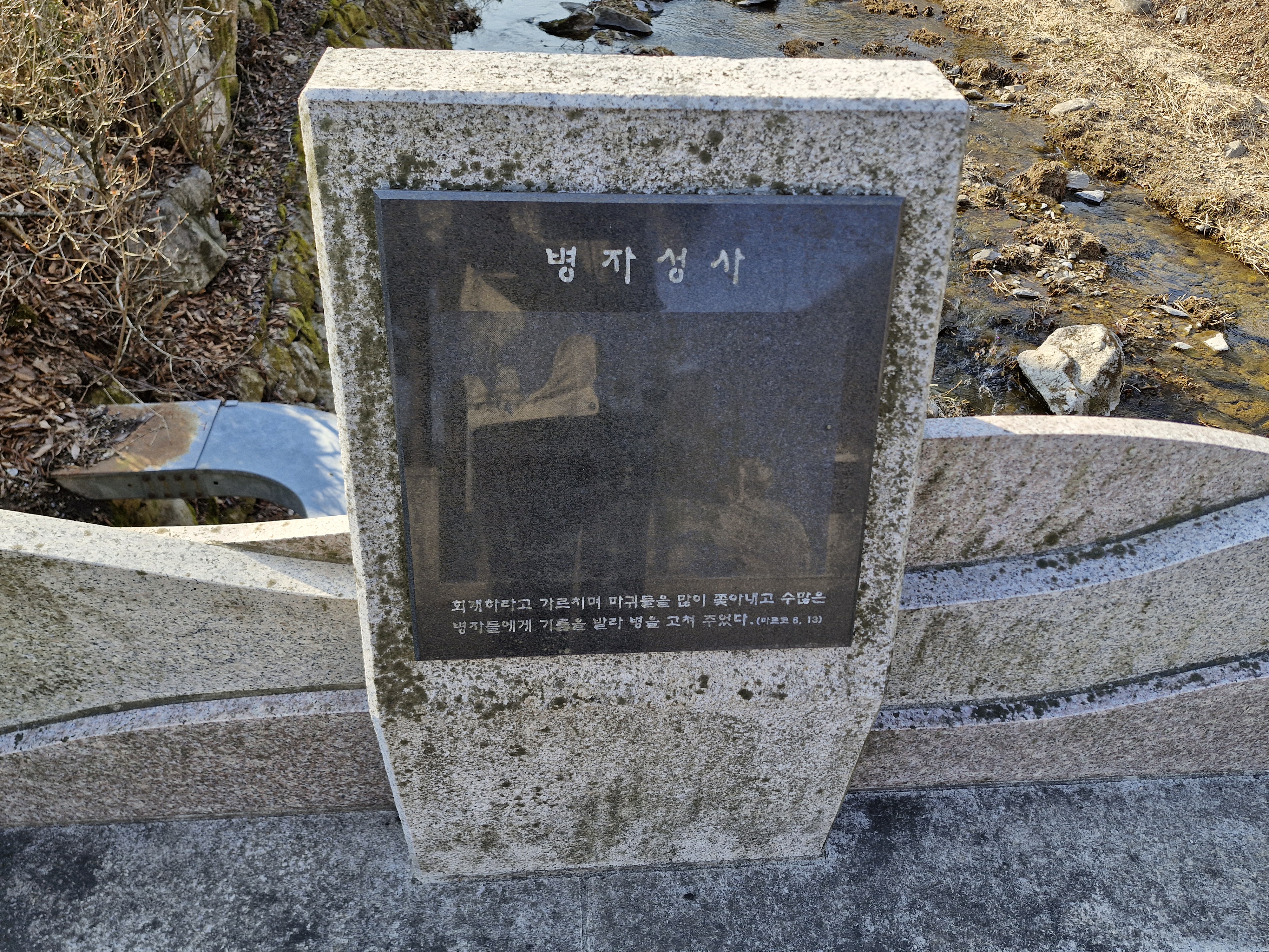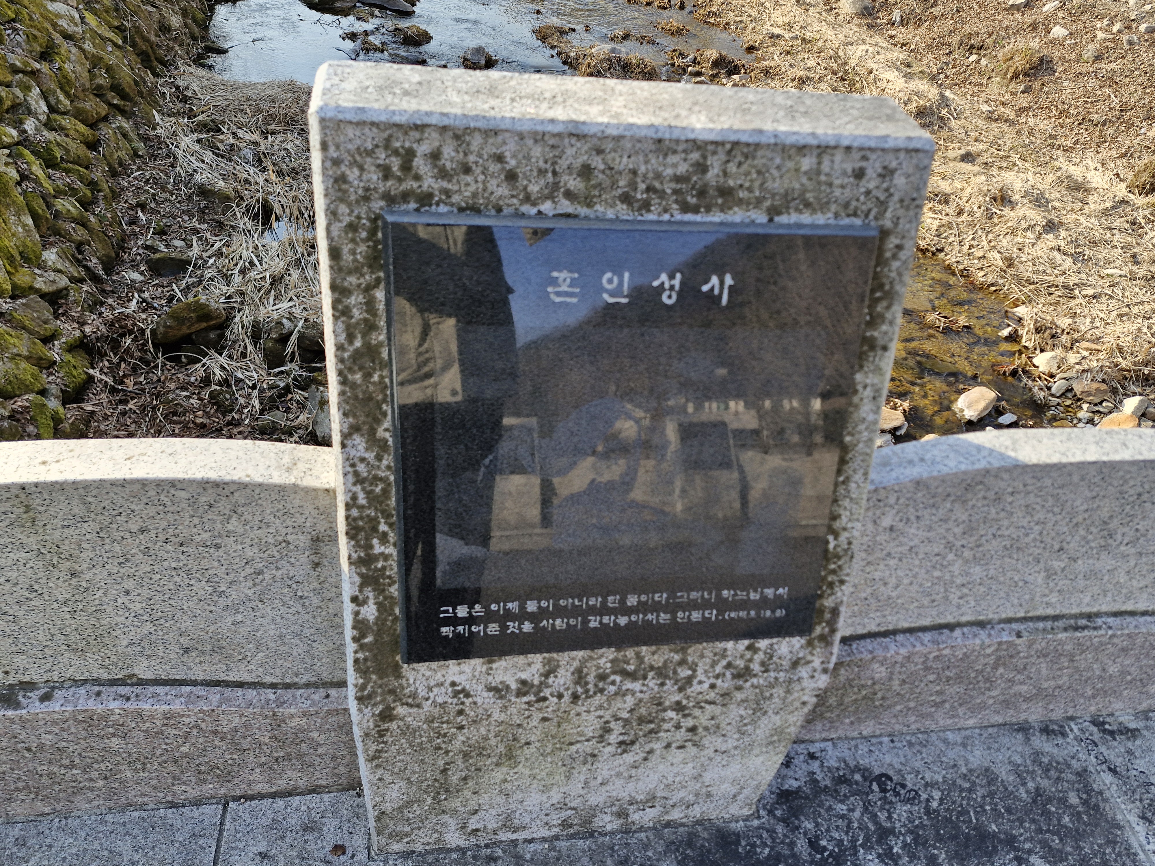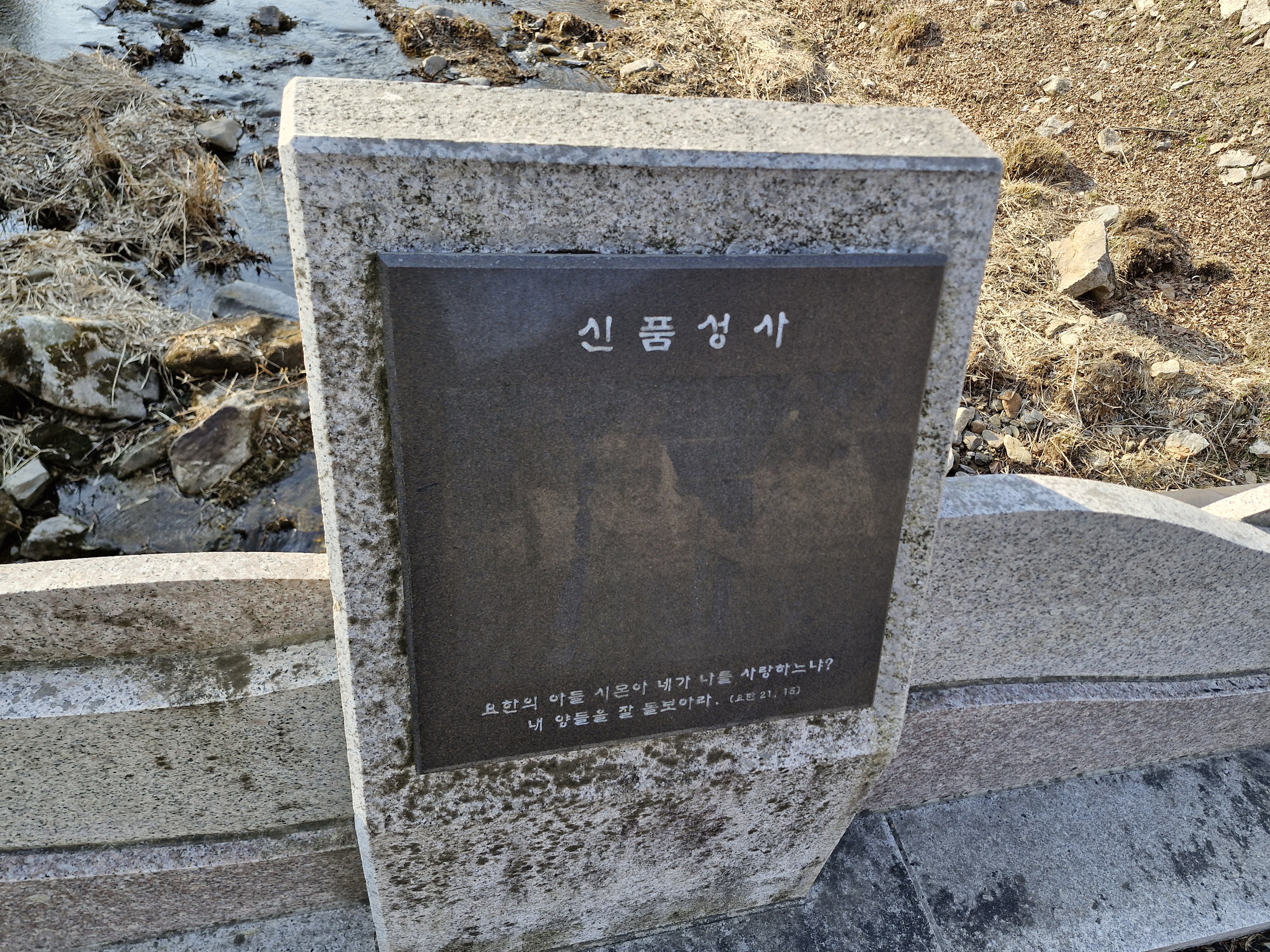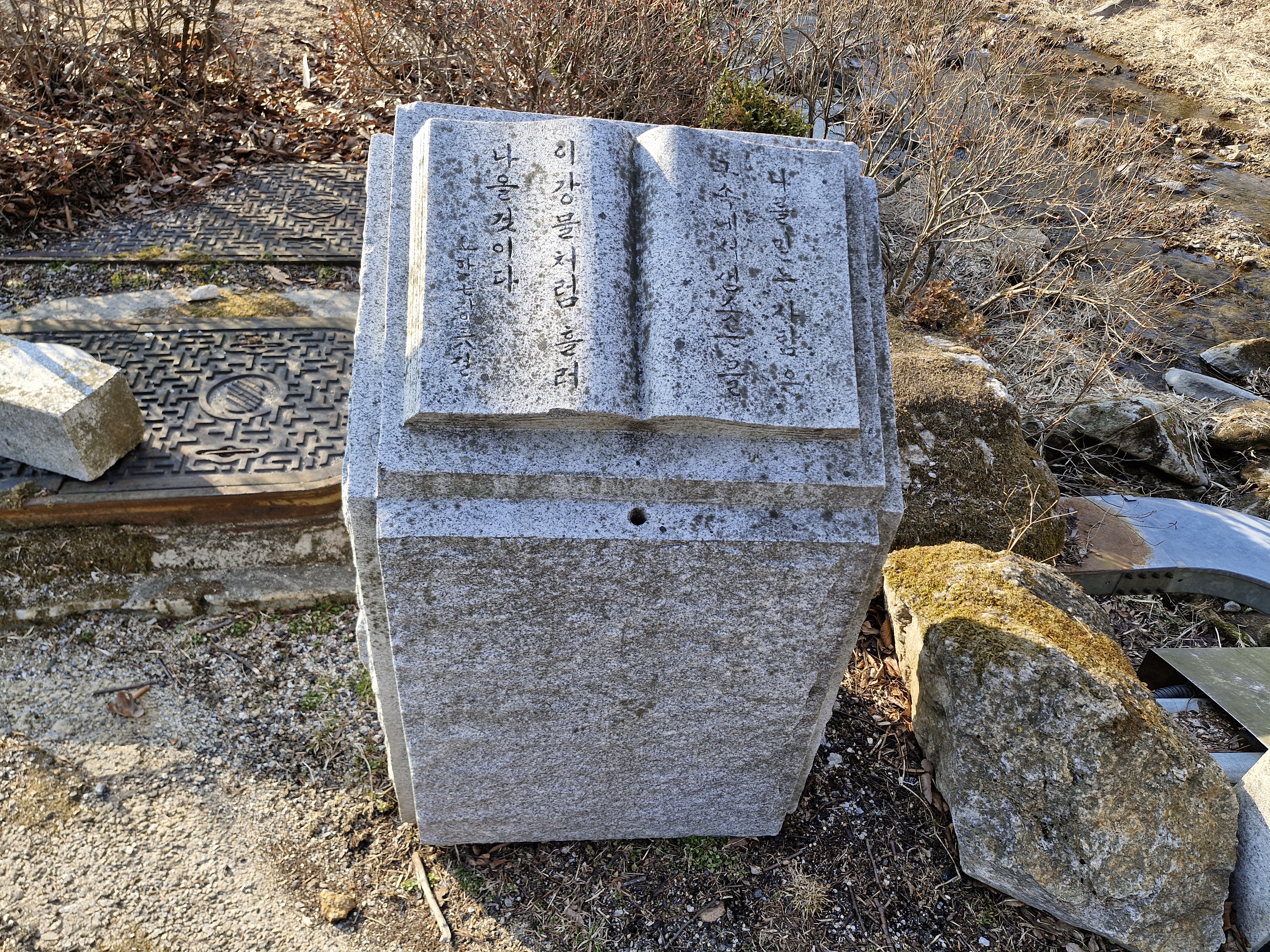 천변에 책모양의 퇴색한 조각품이 버려진 듯 놓여 있다. 요한복음 7장 38절 “나를 믿는 사람은 그 속에서 샘솟는 물이 강물처럼 흘러나올 것이다.”라는 구절이 새겨져 있다.
