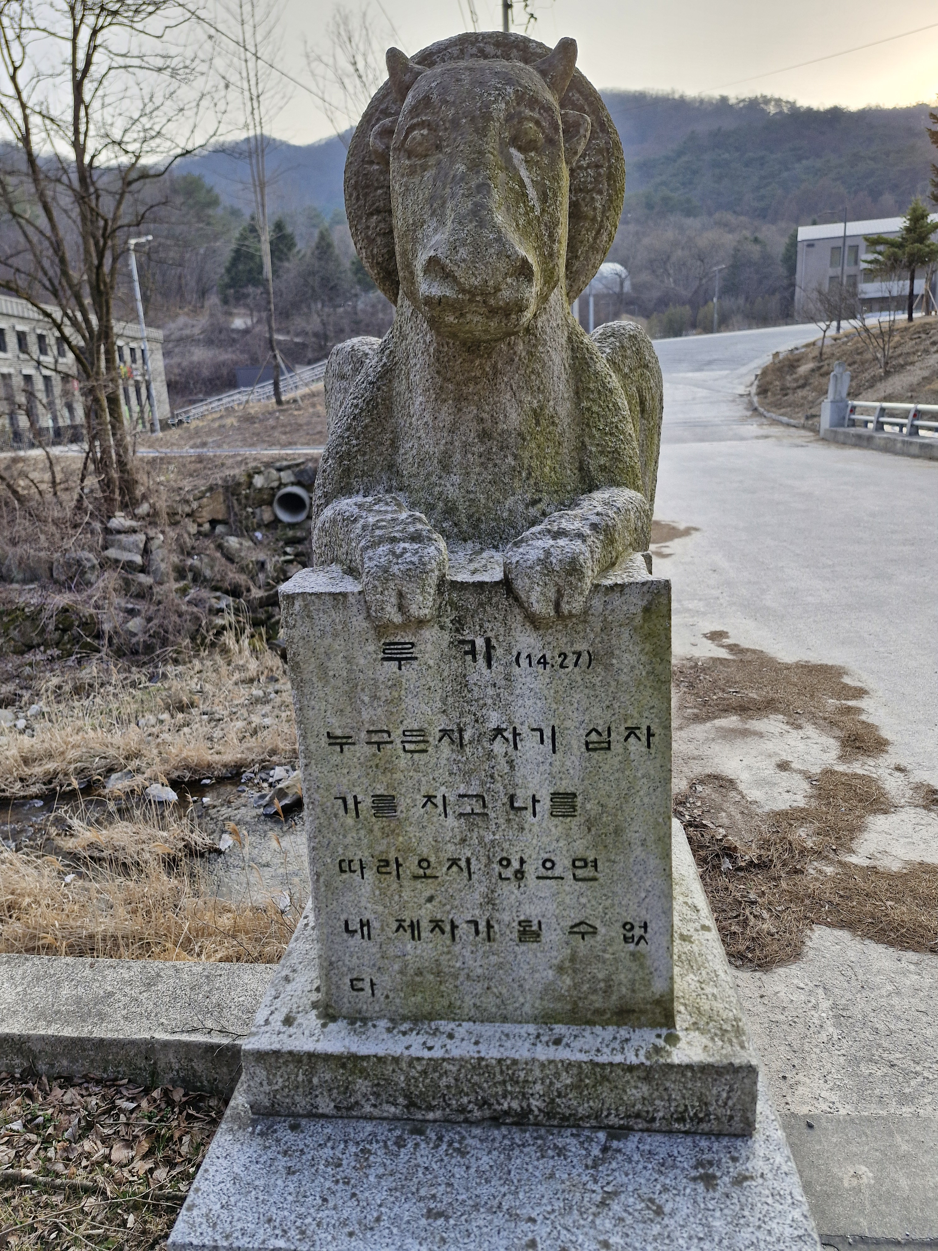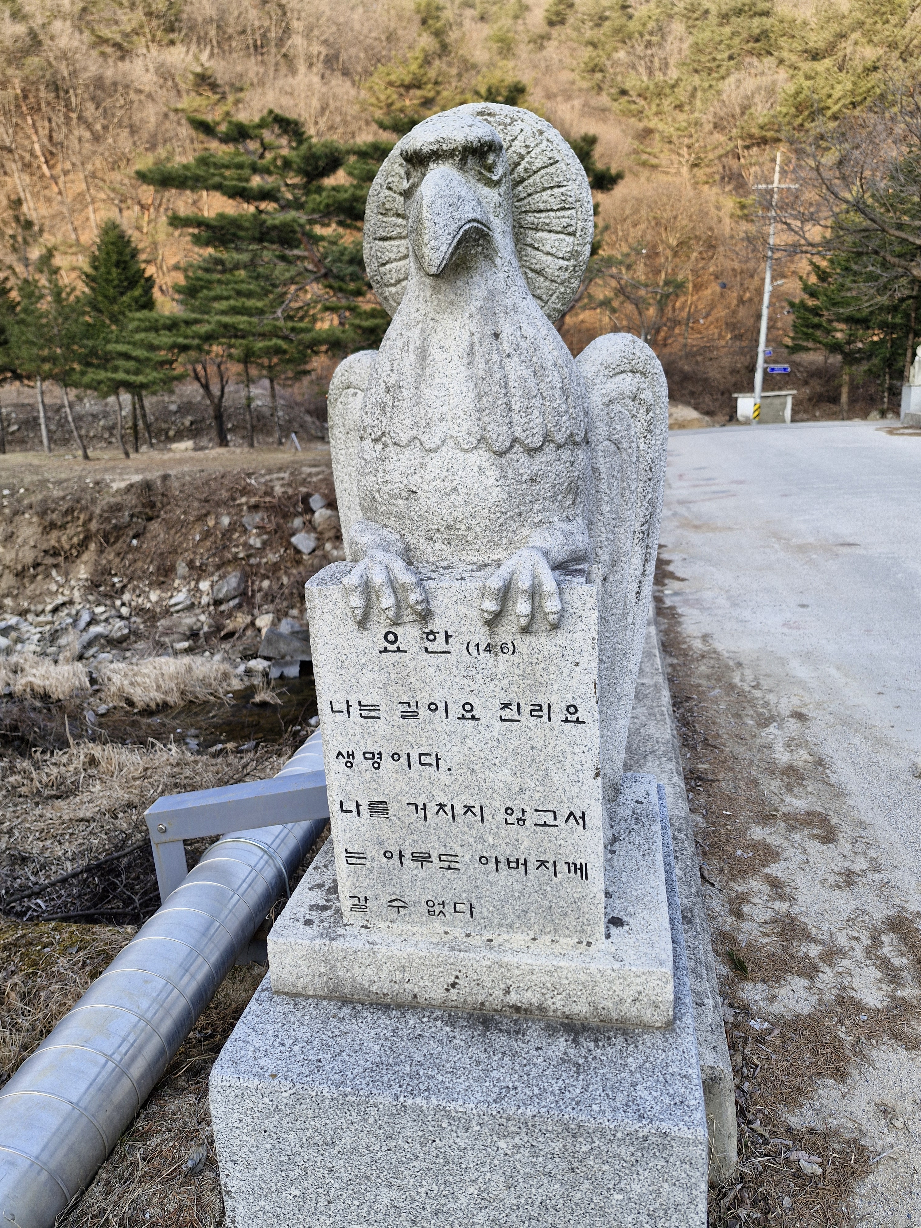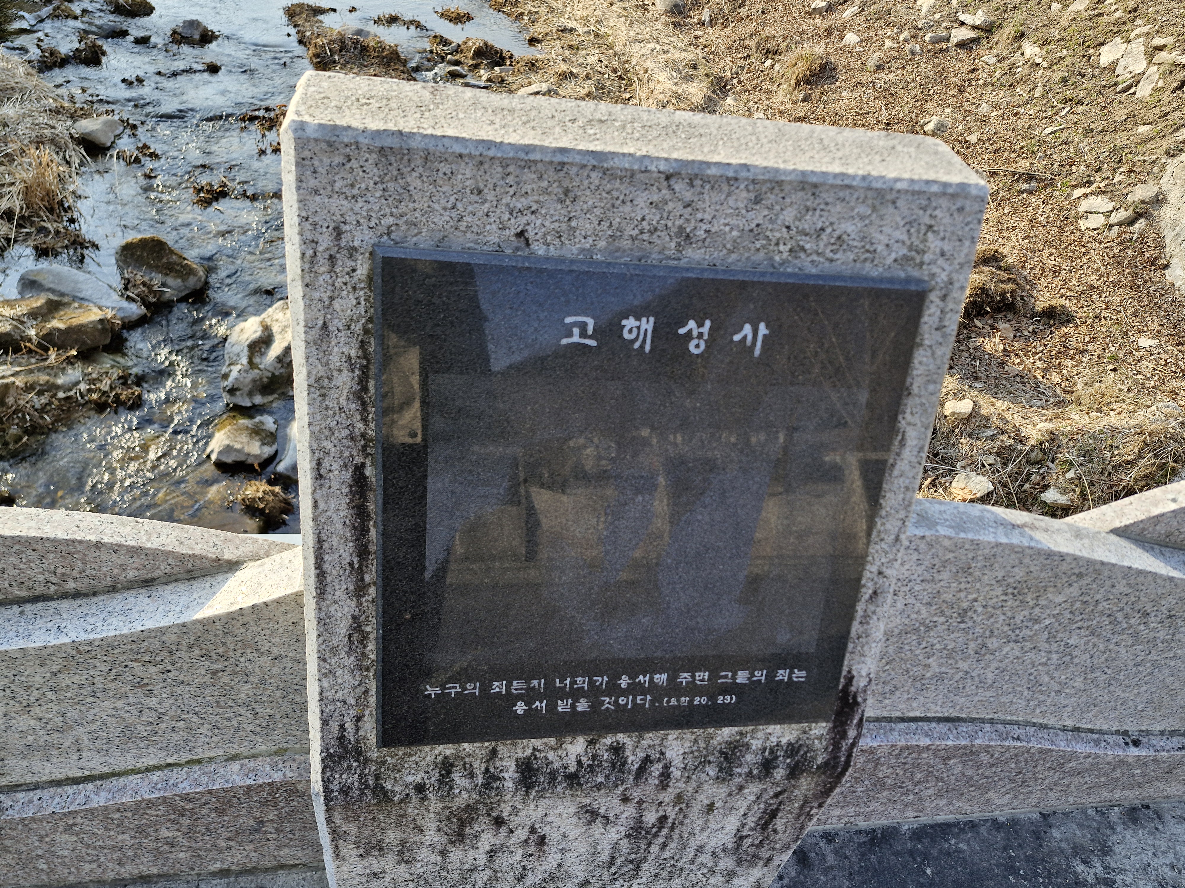 천변에 책모양의 퇴색한 조각품이 버려진 듯 놓여 있다. 요한복음 7장 38절 “나를 믿는 사람은 그 속에서 샘솟는 물이 강물처럼 흘러나올 것이다.”라는 구절이 새겨져 있다.