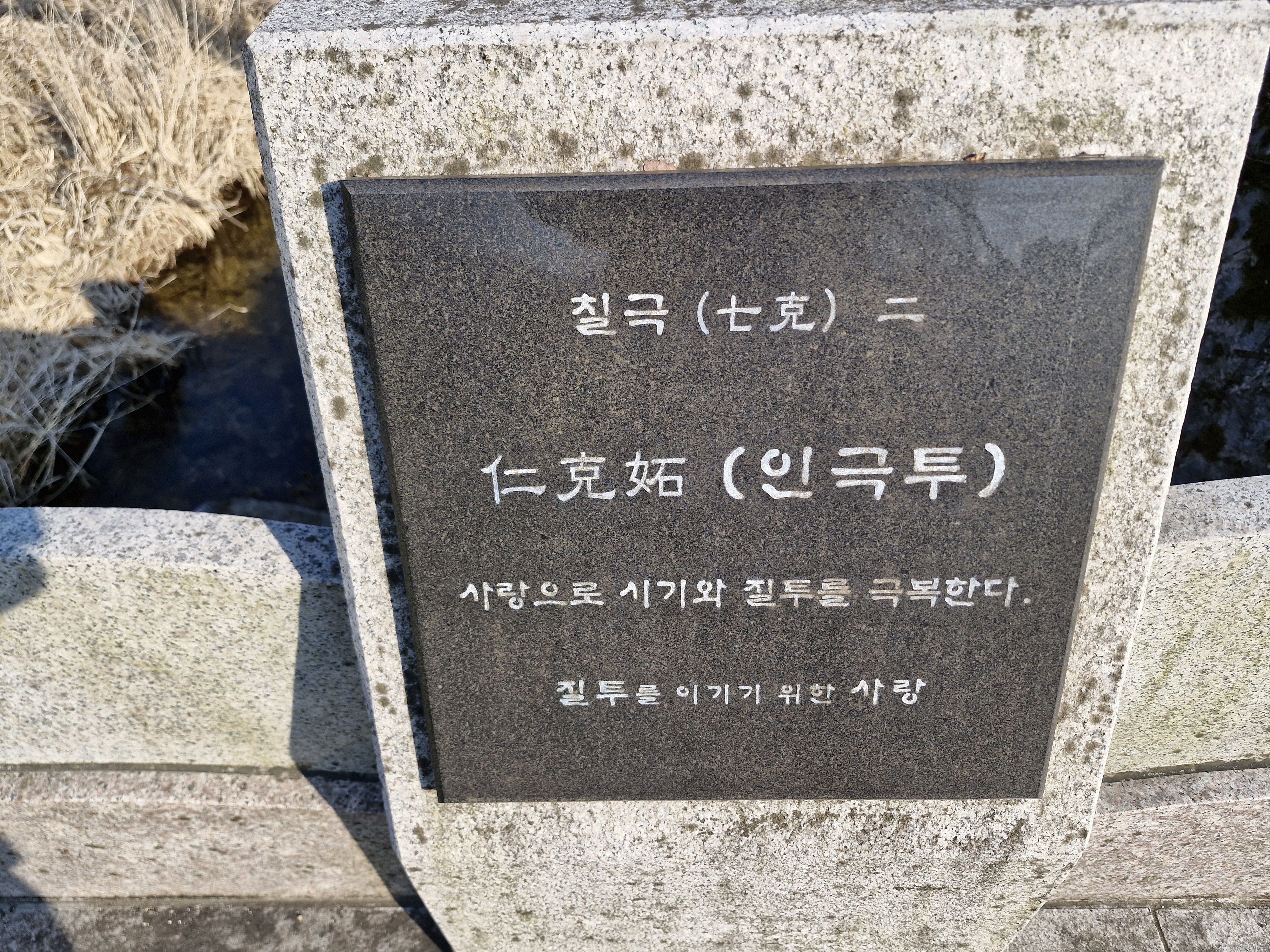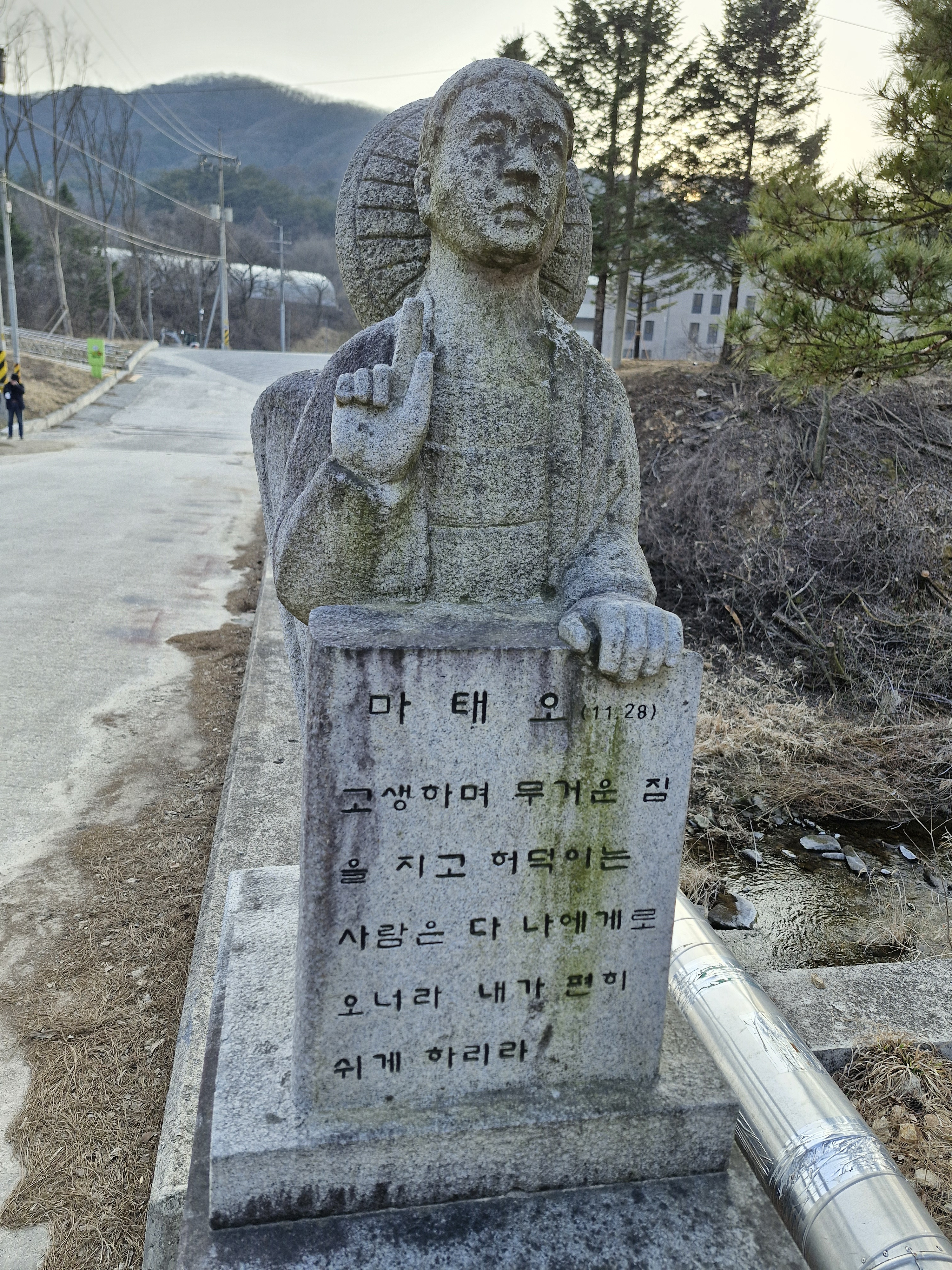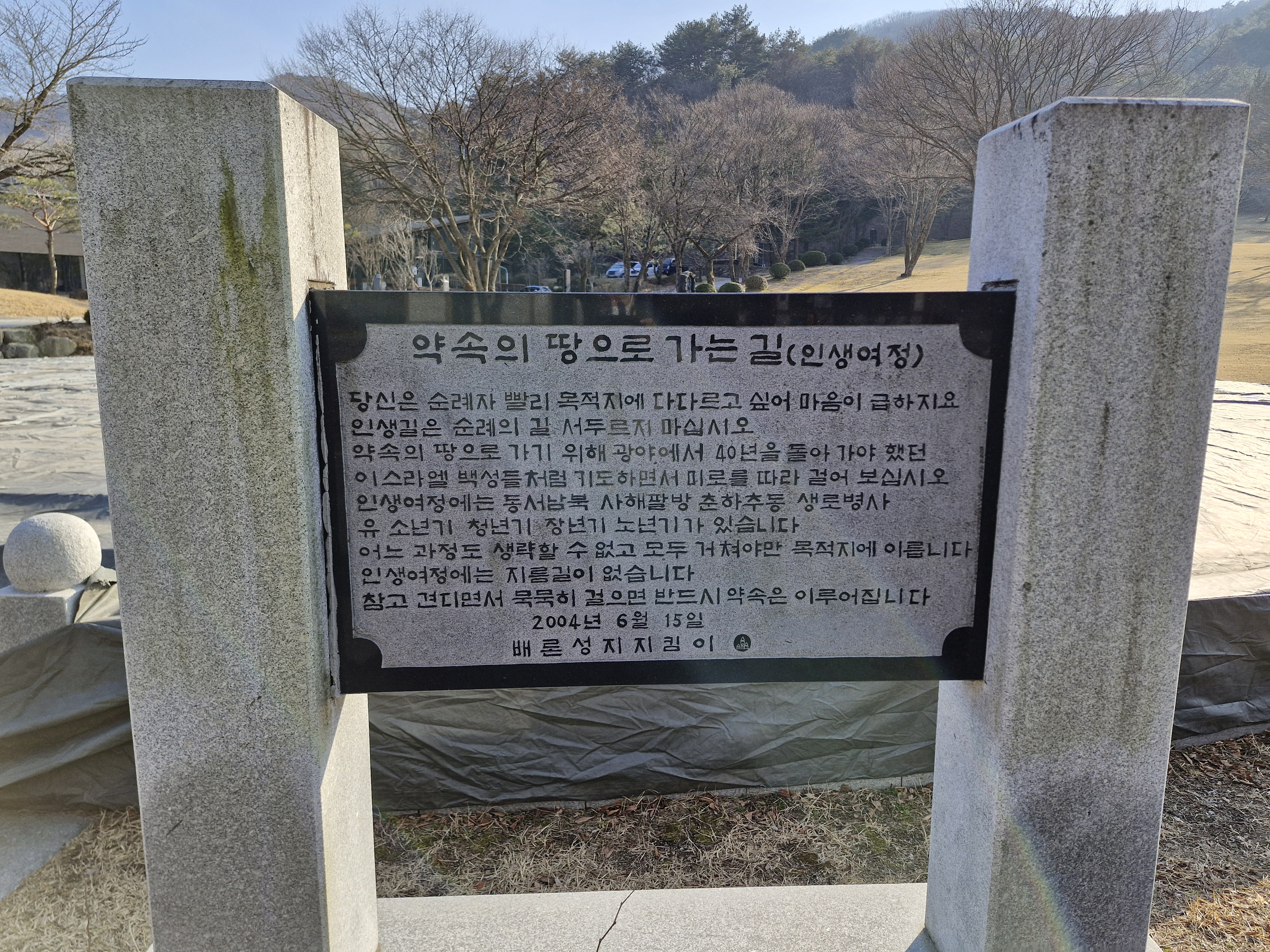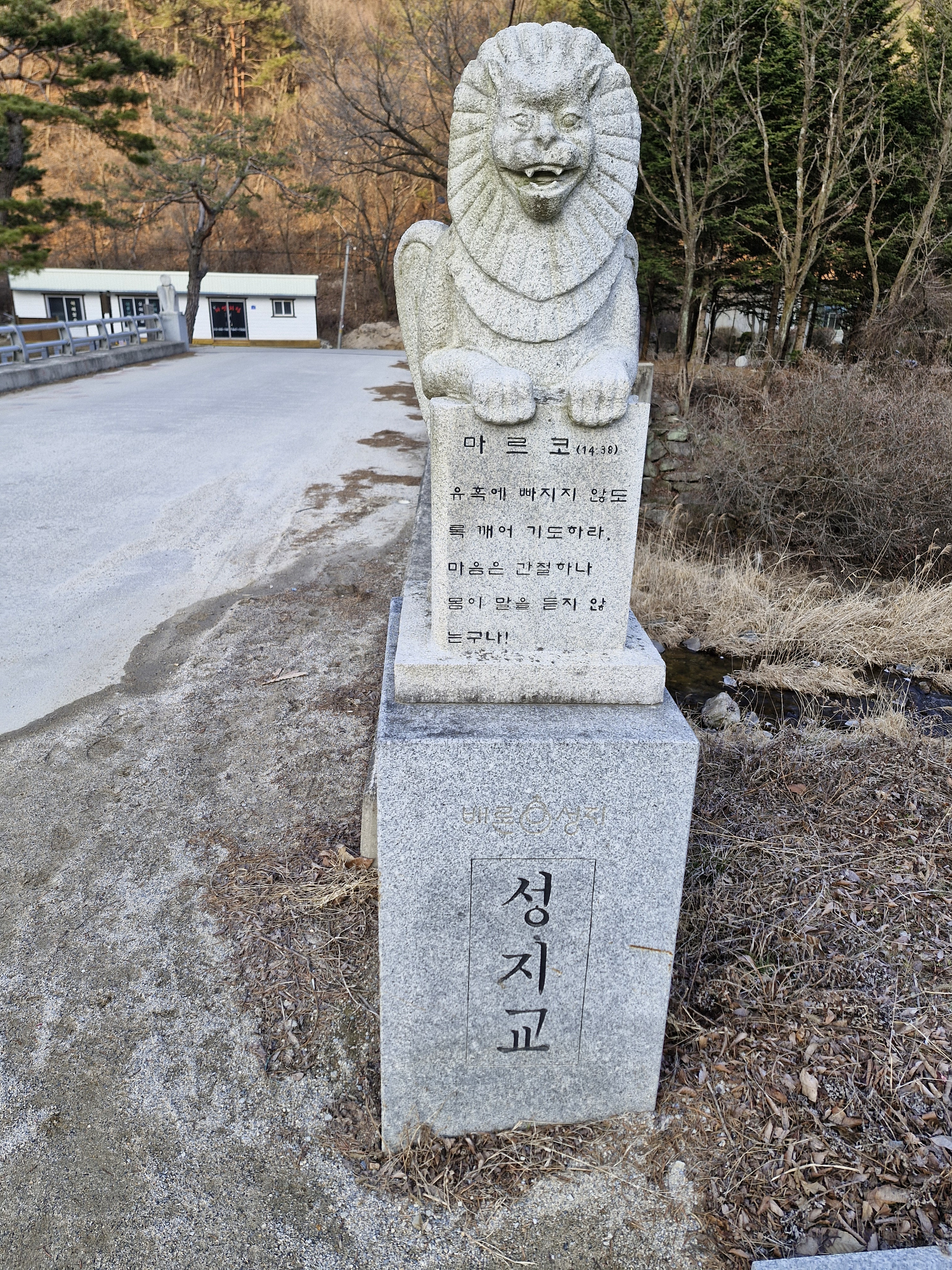 천변에 책모양의 퇴색한 조각품이 버려진 듯 놓여 있다. 요한복음 7장 38절 “나를 믿는 사람은 그 속에서 샘솟는 물이 강물처럼 흘러나올 것이다.”라는 구절이 새겨져 있다.