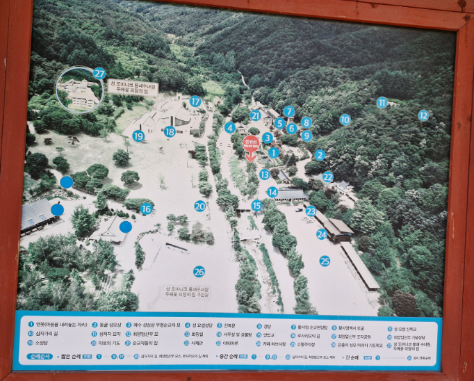 입구를 통과하여 성지에 가까이 가면 여러 개의 안내 표지판이나 배치도가 나오는데 시설이 많고 넓기도 하여 이를 보고 미리 성지 순례의 동선을 정해야 한다.