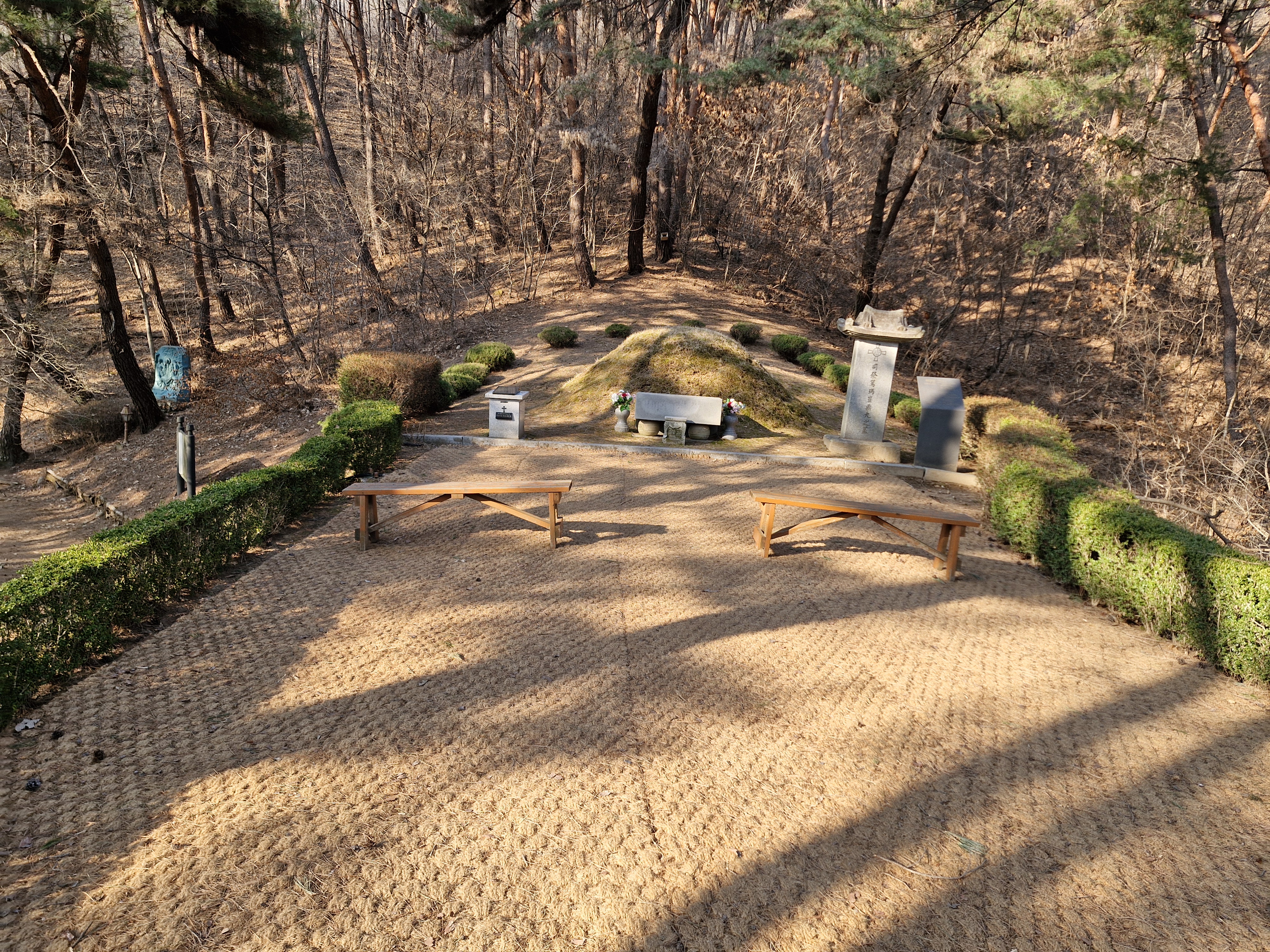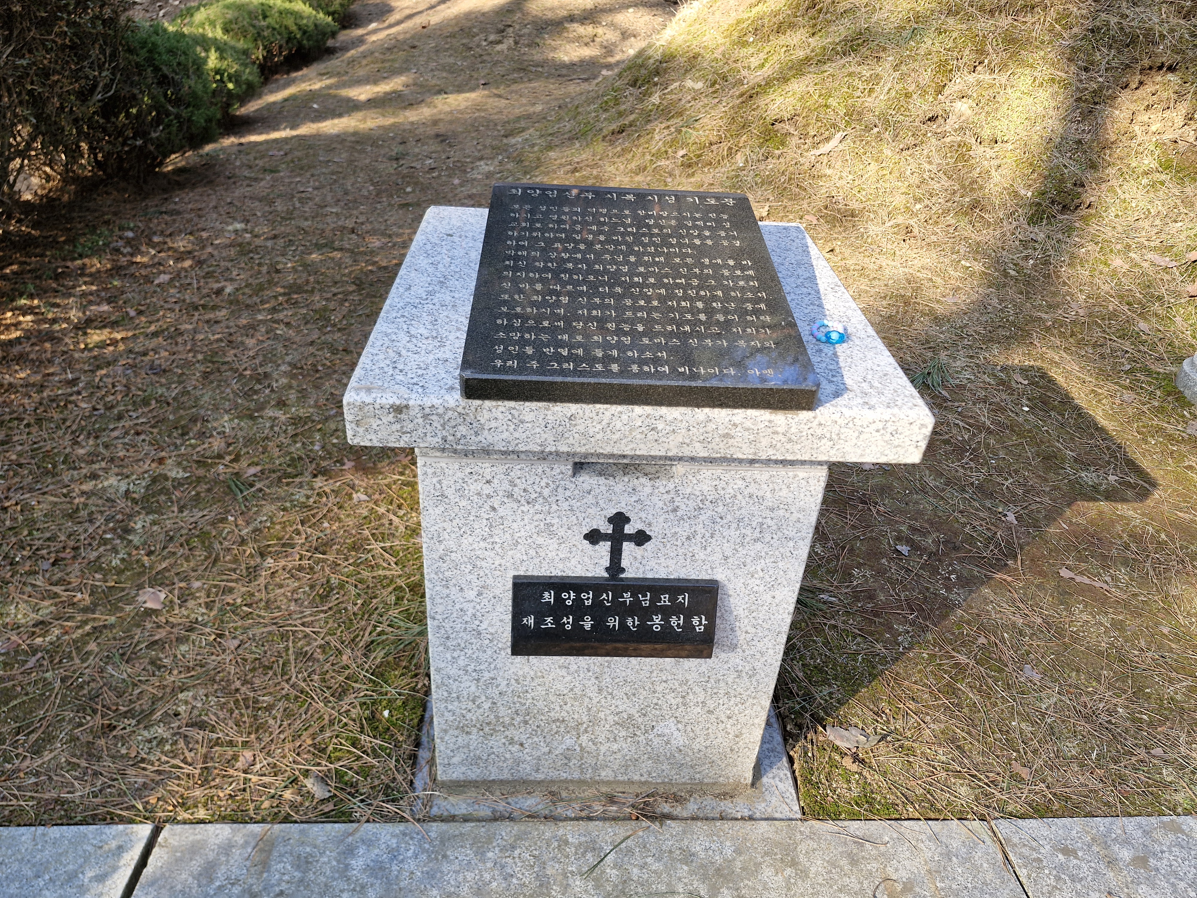 마침내 나타난 묘소는 언뜻 보아도 좋은 터인 것 같다. 등성이에 위치하며 양쪽 계곡으로 물길이 감돌고 좌우의 산세가 안온하게 묘를 감싼 듯하다. 묘제도 전통적인 봉분형에 묘비와 상석도 전통양식이었다. 오른쪽에 묘비, 왼쪽엔 최양업 신부 시복 시성 기도문과 함께 최양업 신부 묘 재조성용 봉헌함도 놓였다.