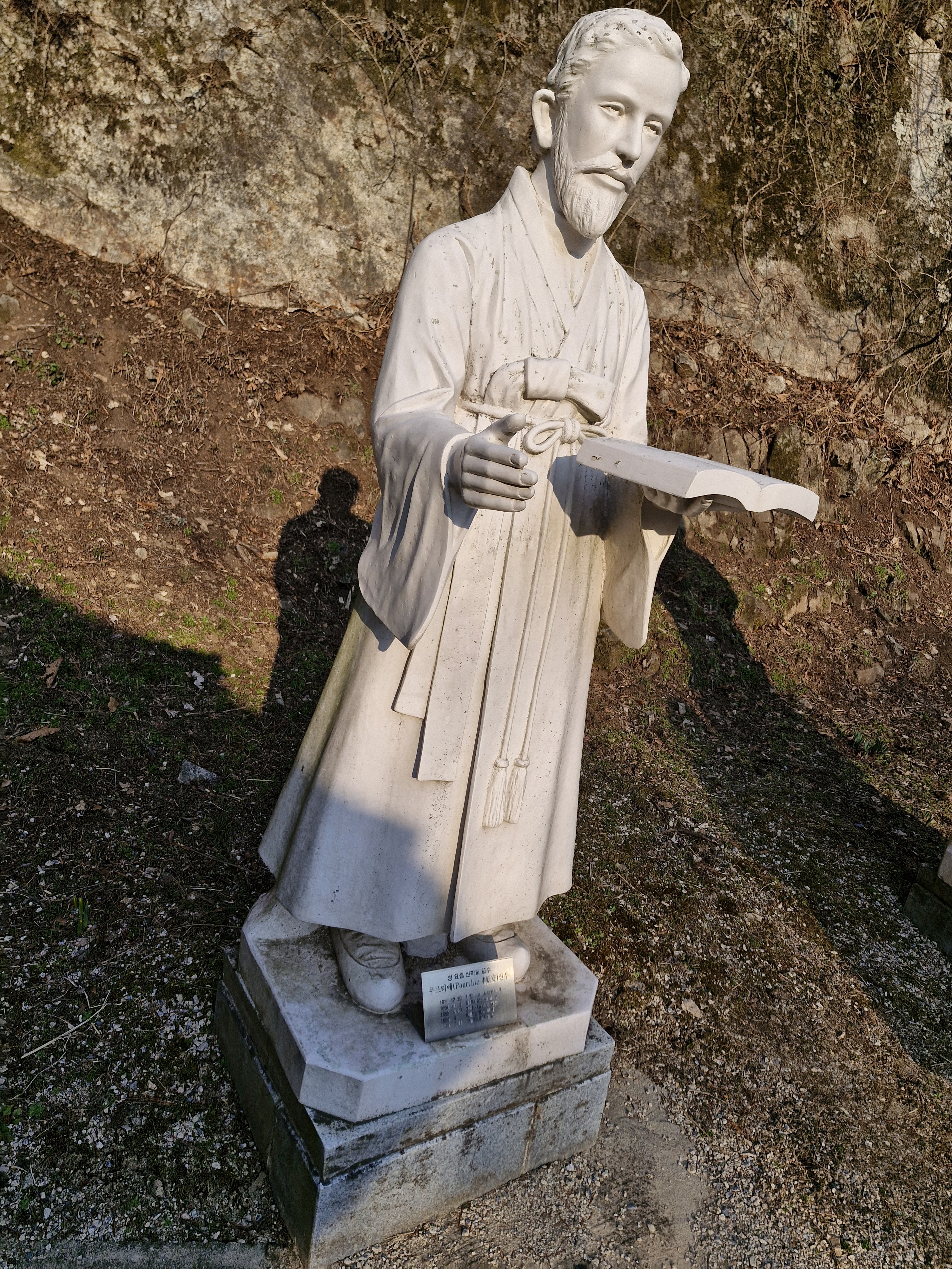 이 석상은 1984년에 세웠으며 옆에 봉헌자 명단 비석이 희미한 글자로 남았는데 읽어보니 전면 제자(題字) 인 최도마 양업신부상은 지학순 주교가 썼다.