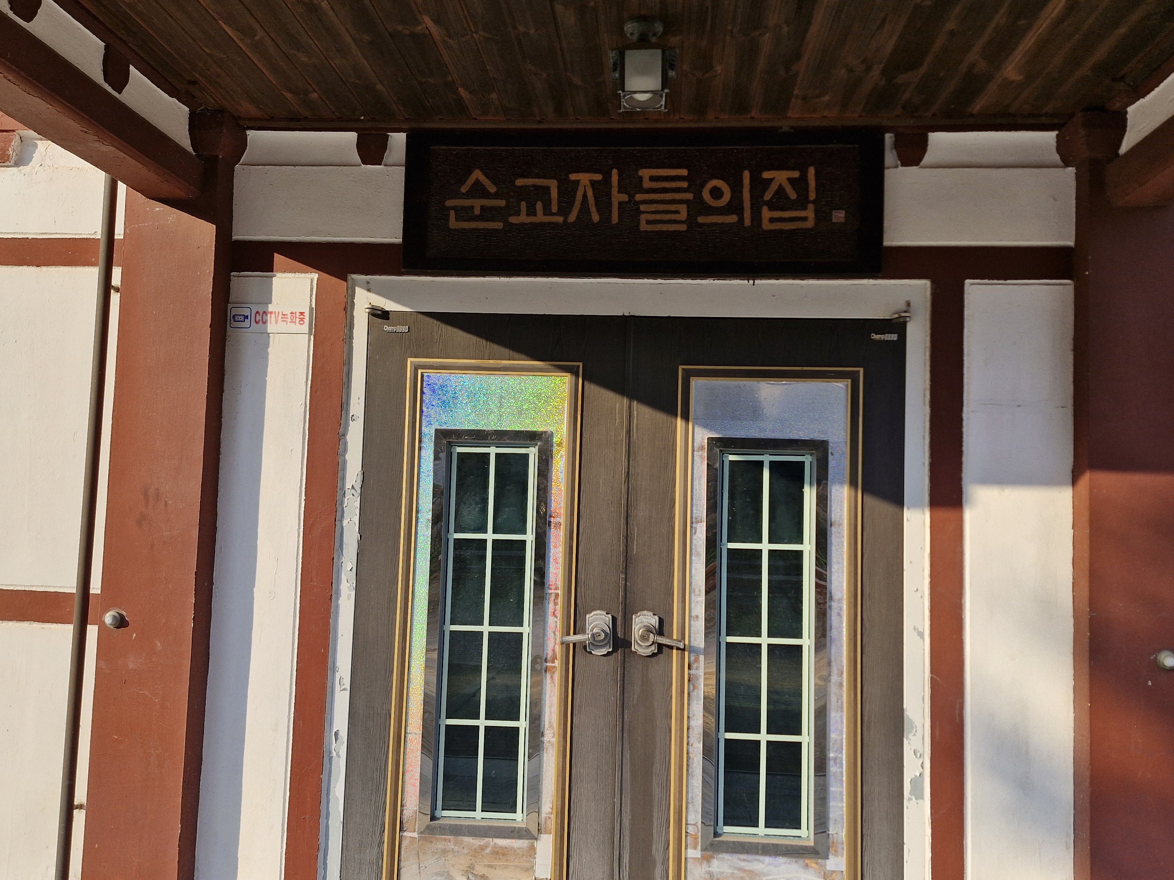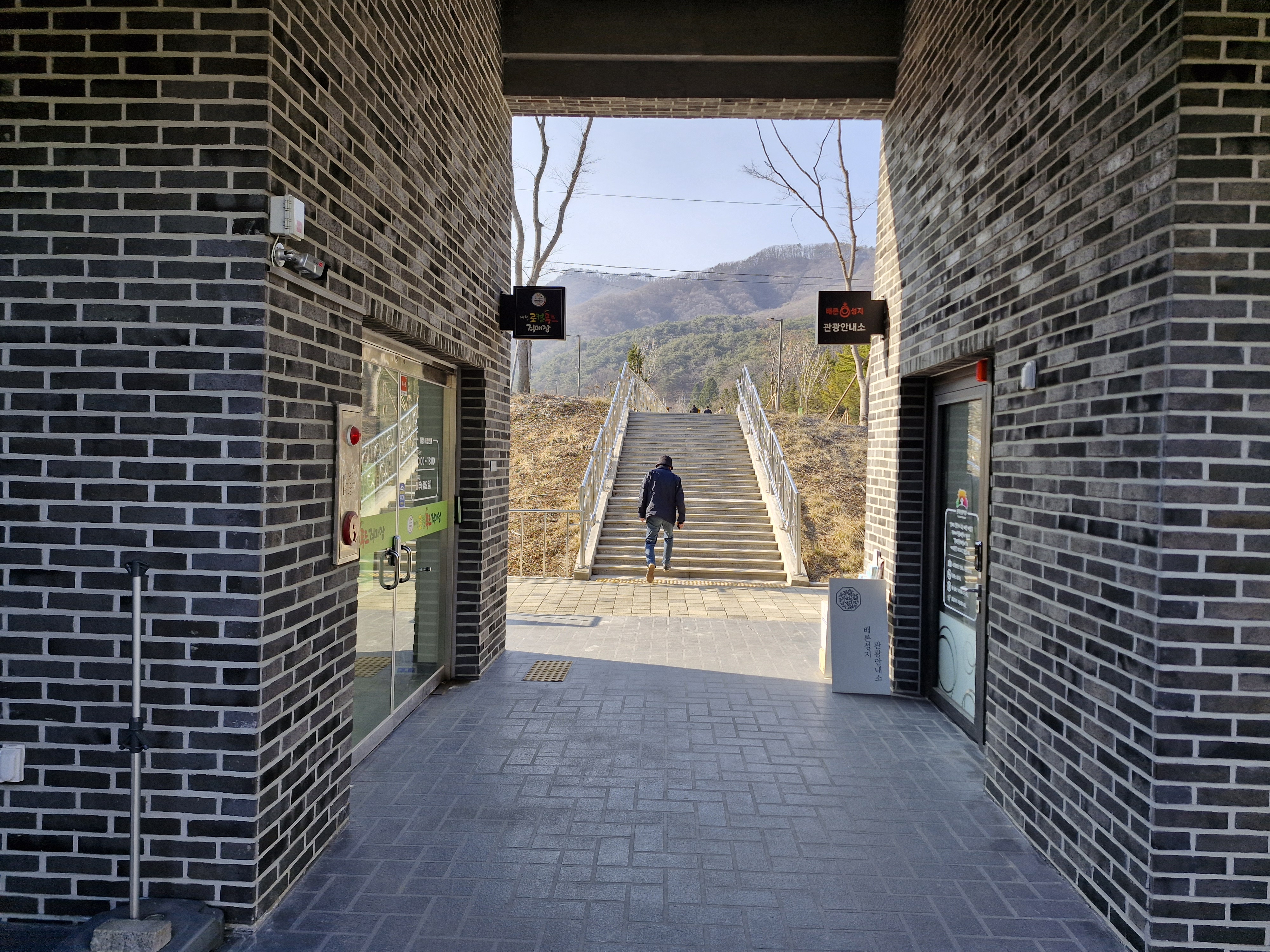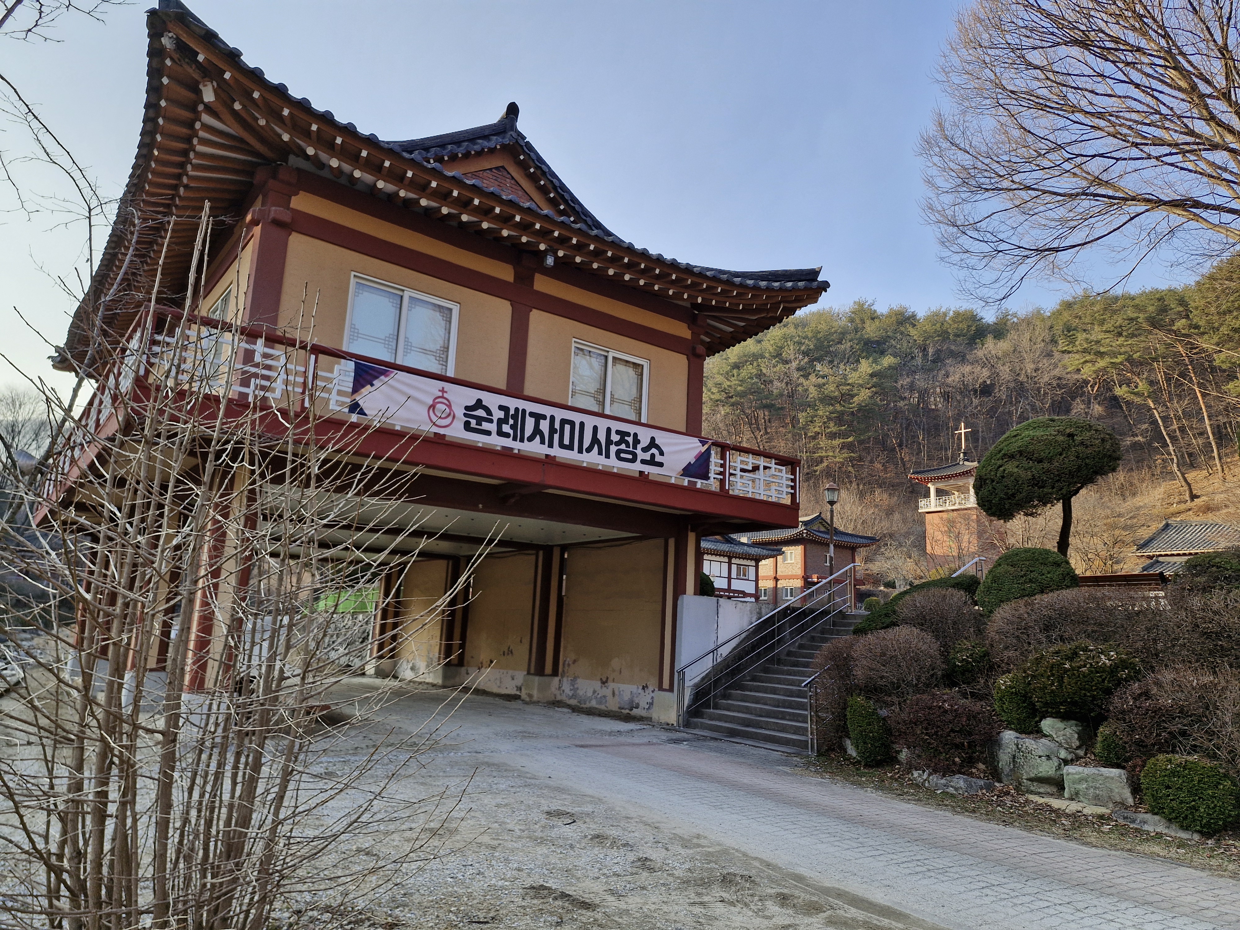 오후 4시가 넘어 베론 성지에 도착했다. 이외로 성지가 매우 넓다. 입구 주차장에 내려 성지 쪽으로 가니 먼저 나타난 것은 로컬푸드관과 화장실이다. 성지로 들어가는 입구는 두 건물 사이에 매우 좁게 나 있다. 마치 관광지 휴게소에서 상품 판매소를 거쳐 화장실에 가는 것을 연상하게 한다. 왜 성지 정면에 높은 건물과 화장실을 세워 성지 시야를 가리고, 농산품 판매소를 거치도록 했는지 의문이다. 성서에 나오는 좁은 문으로 들어가라는 뜻일까? 처음 온 사람들은 성지 입구를 찾기가 쉽지 않다.