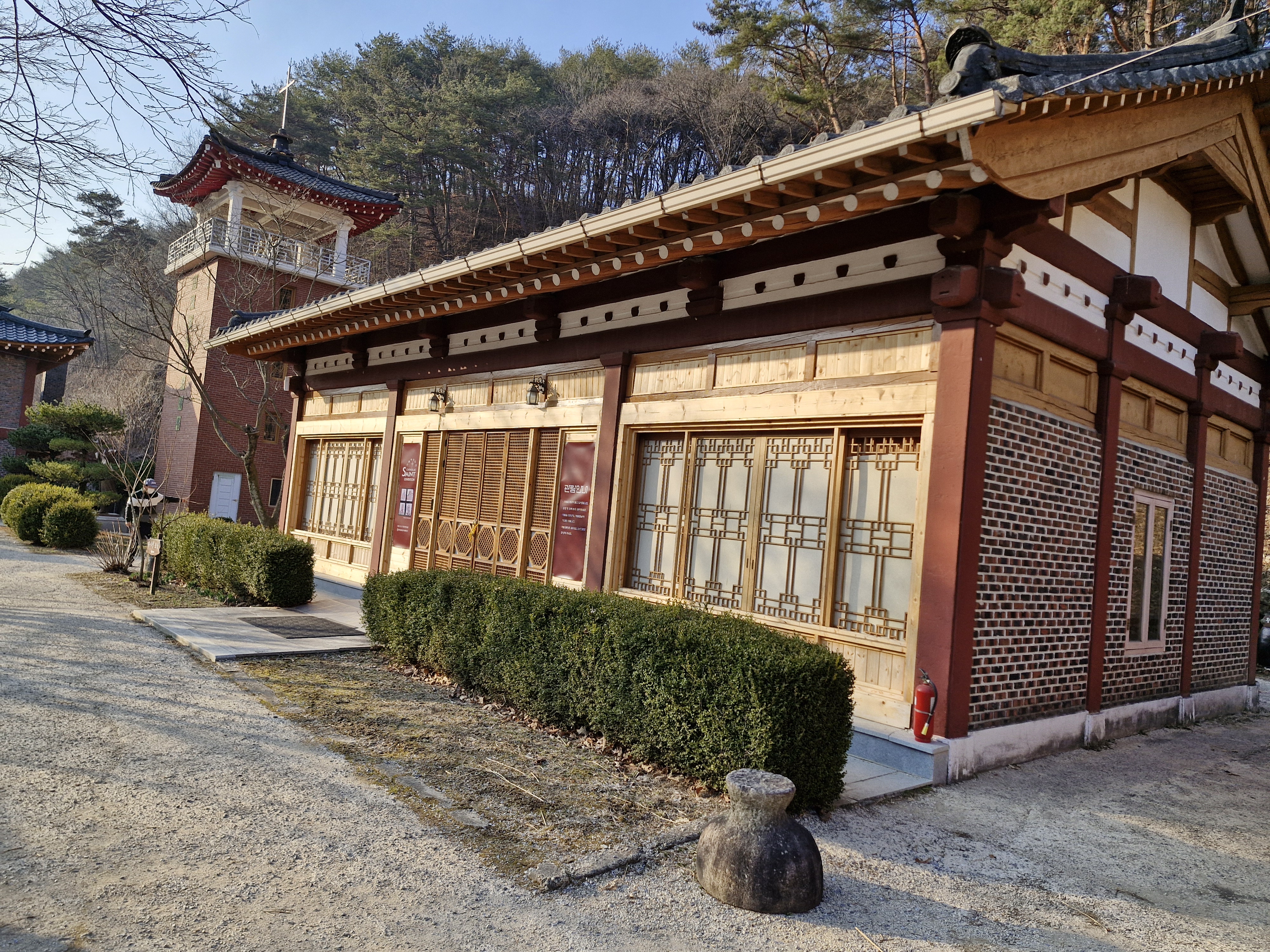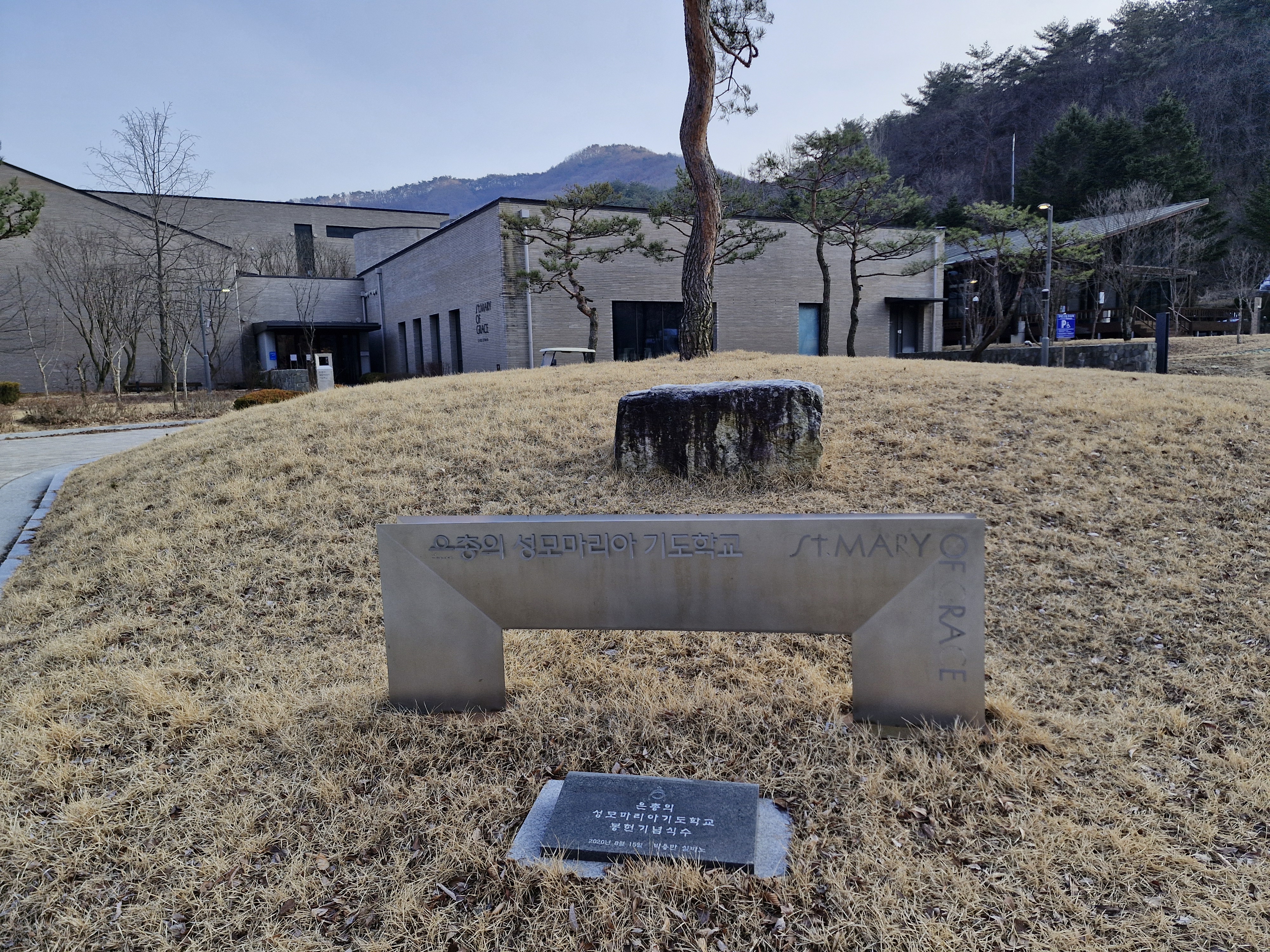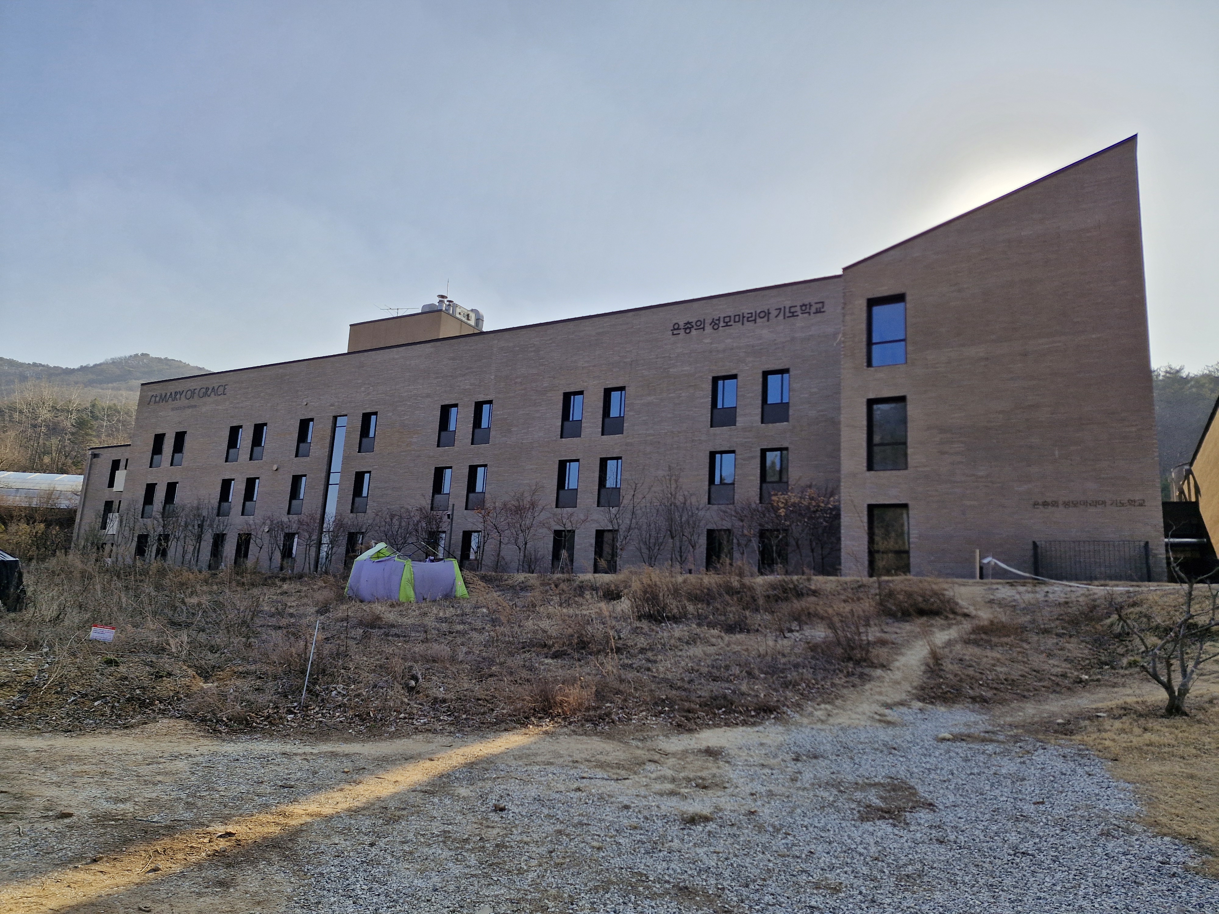 가장 먼저 나타나는 시설은 2020년에 봉헌된 피정시설인 은총의 성모 마리아 기도학교이다.