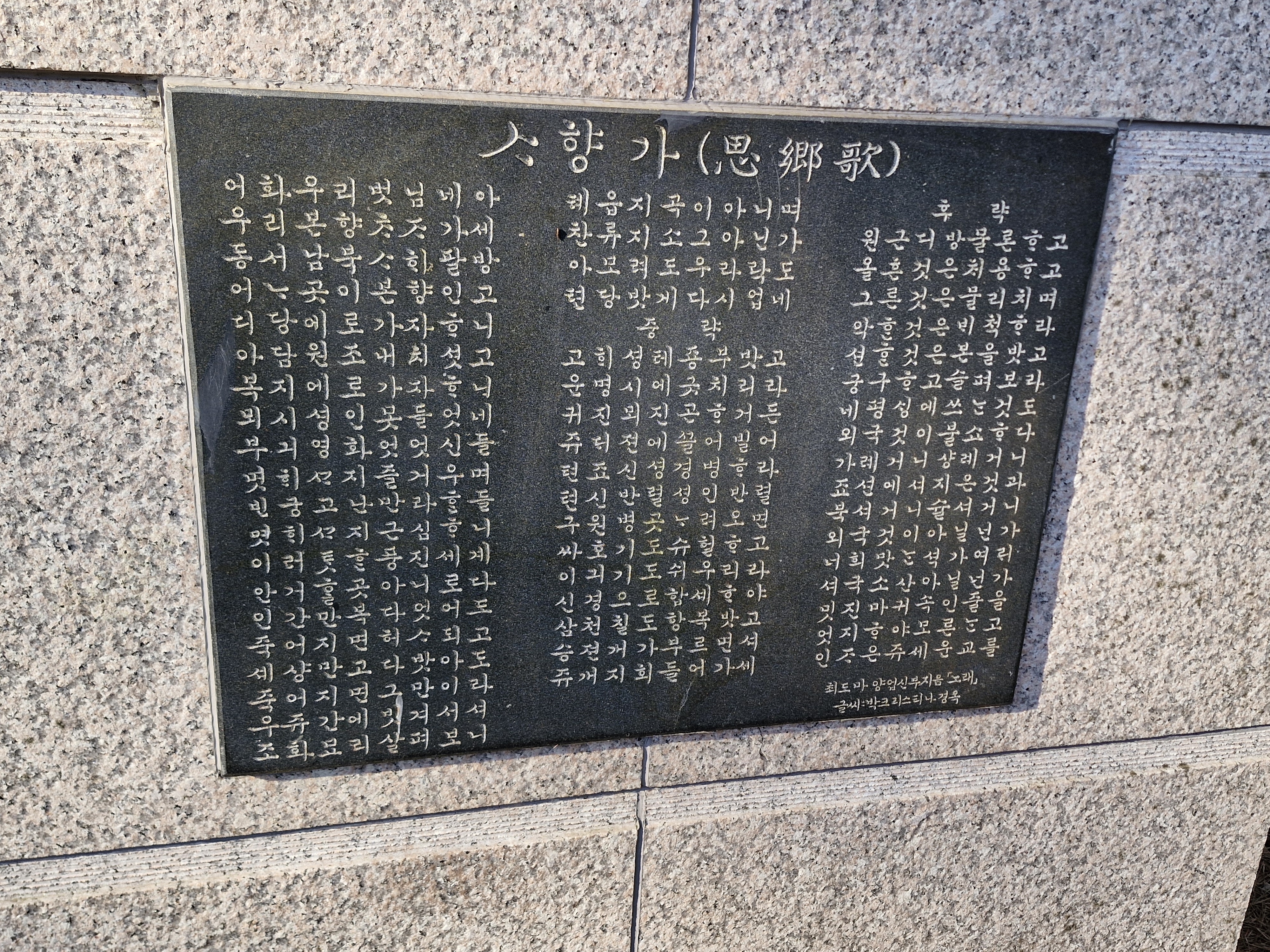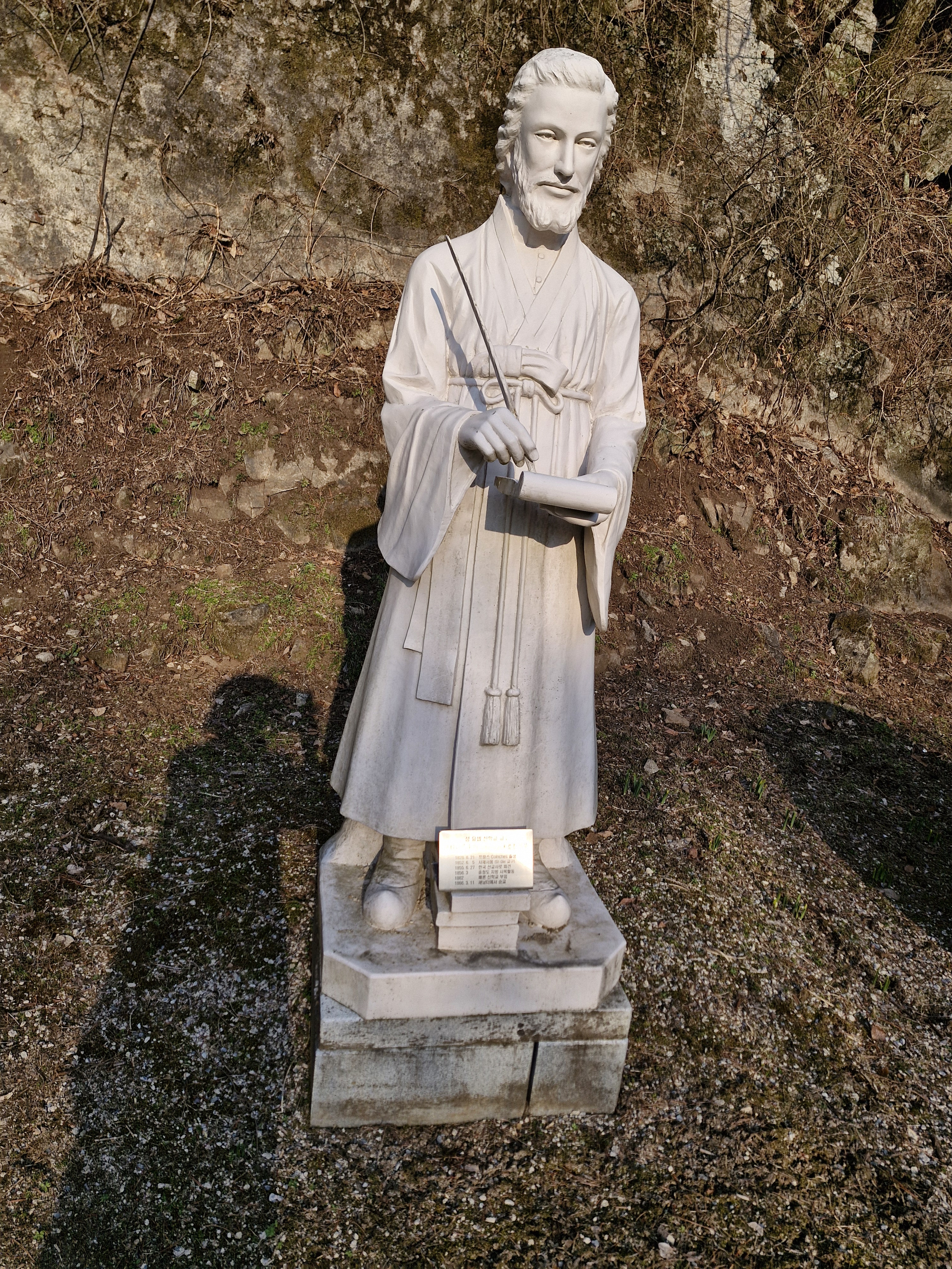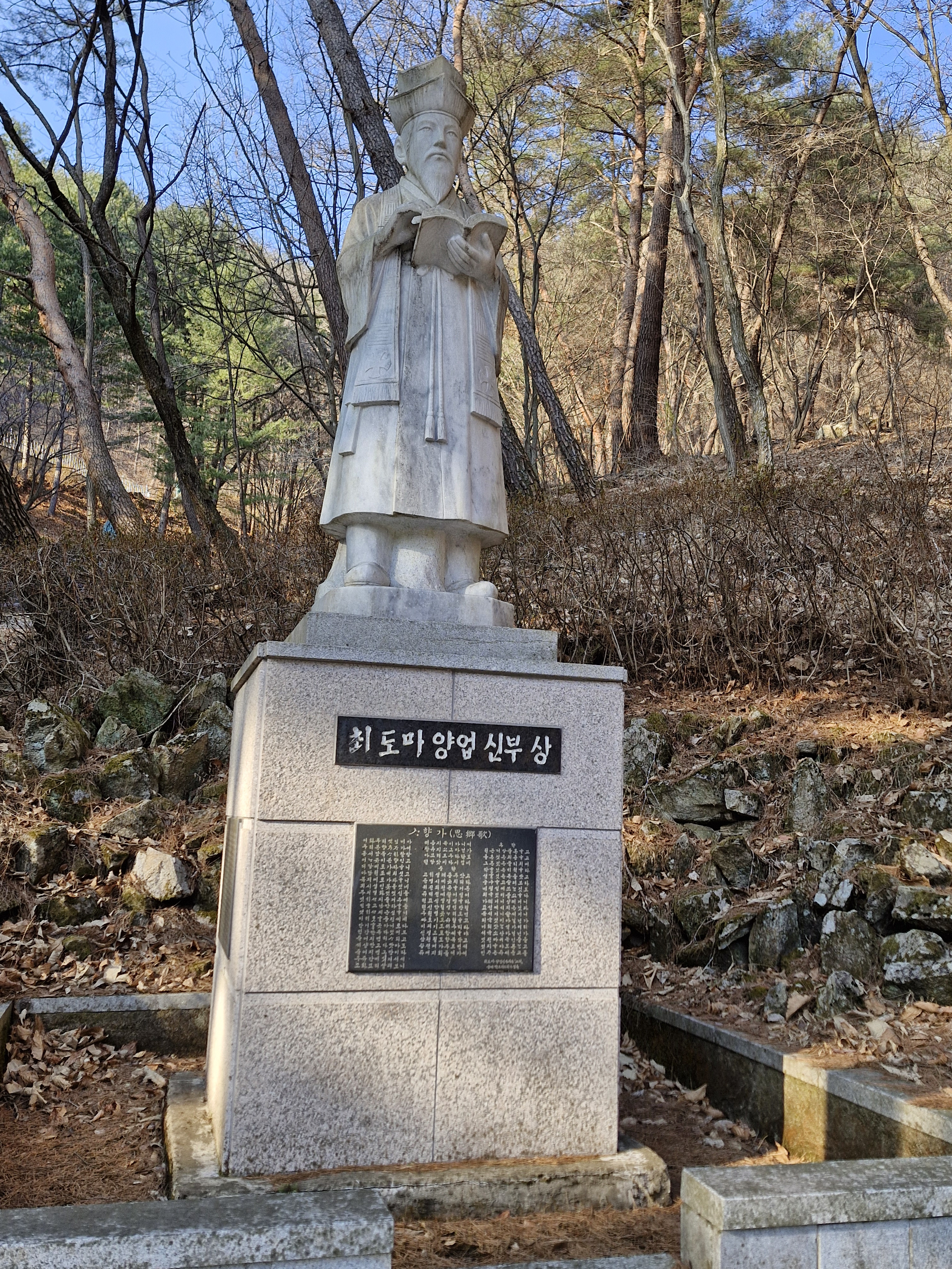 최양업 신부 묘소로 가는 오르막길 바로 밑에는 최양업 신부 석상이 있다. 대좌 측면에는 약력이 소개되어 있고, 대좌 앞면에는 최양업 신부가 직접 지은 천주가사 사향가가 기록되어 있다. 조선 시대에 유행했던 가사는 3·4조 또는 4·4조 음수율의 4음보 운문시가로 낭송하기도 좋고 우리의 전통정서에 깊이 와 닿기에 신앙심을 고양시키기에 매우 효과적이었다. 사향(思鄕)에서 고향이란 우리의 영원한 고향인 하늘나라를 말한다. 능숙한 라틴어에 가사까지 지은 최양업 신부의 재능이 놀랍다.