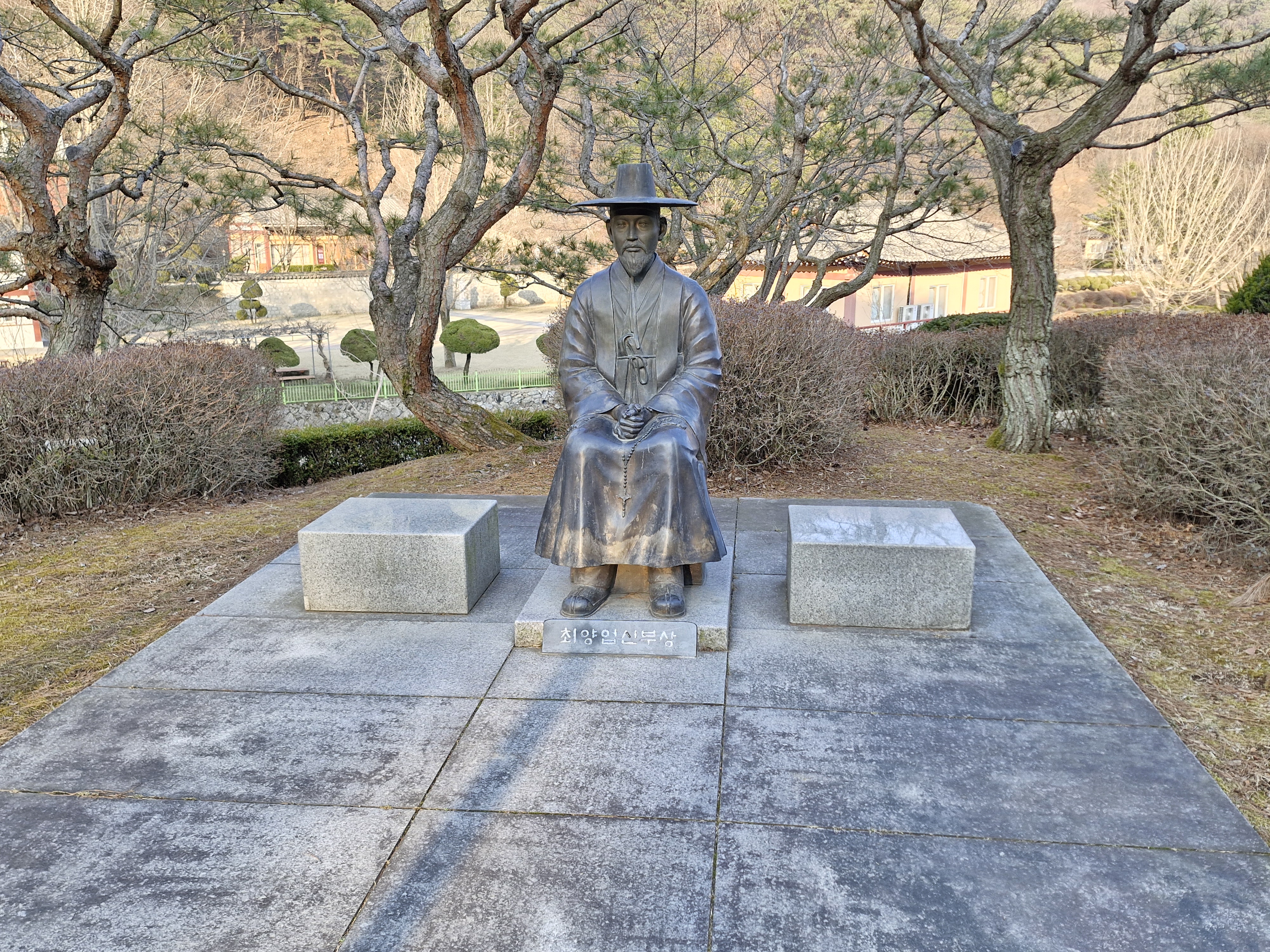 입구에는 조각공원 표지석이 있고 최양업 신부 좌상이 있다.