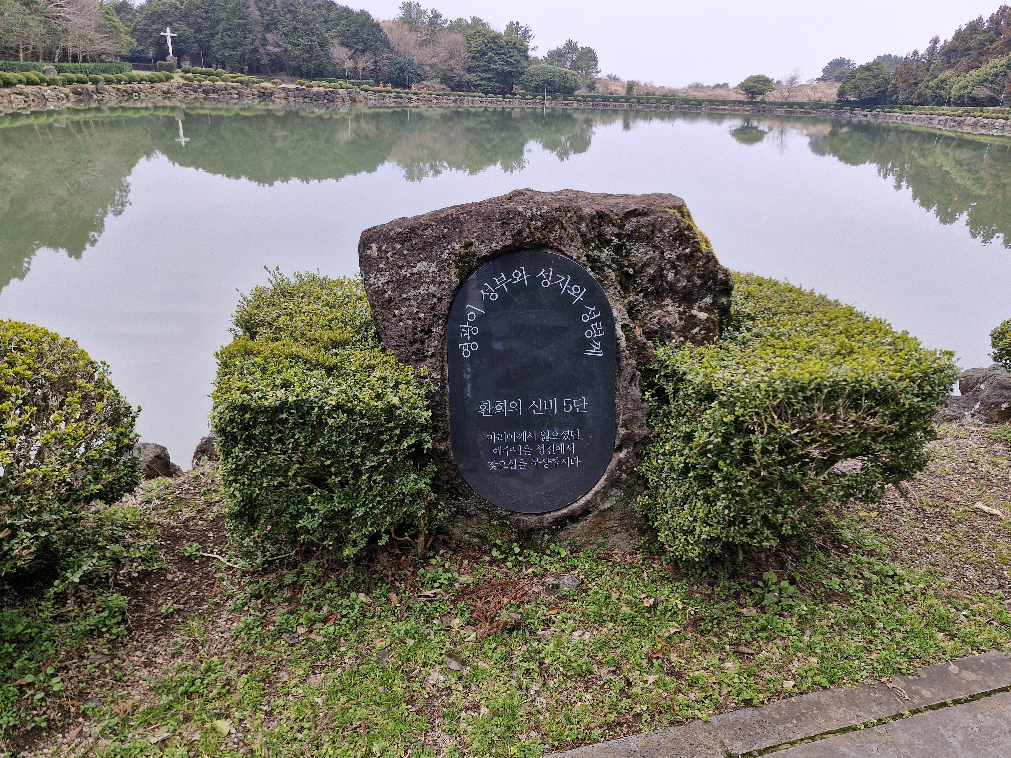 주위의 삼나무 숲과 제주의 하늘을 거울처럼 비춰내는 삼뫼소는 15단 묵주형태로 조성돼 있어 주위를 돌면서 명상을 하기에 적당하다. 호수 주위에는 야외미사를 진행할 수 있는 성모동굴도 있고, 부드러운 오르막길 끝에는 저마다 다른 목적의 기도에 맞는 제단이 세워진 봉긋한 오름 정상이 있다.