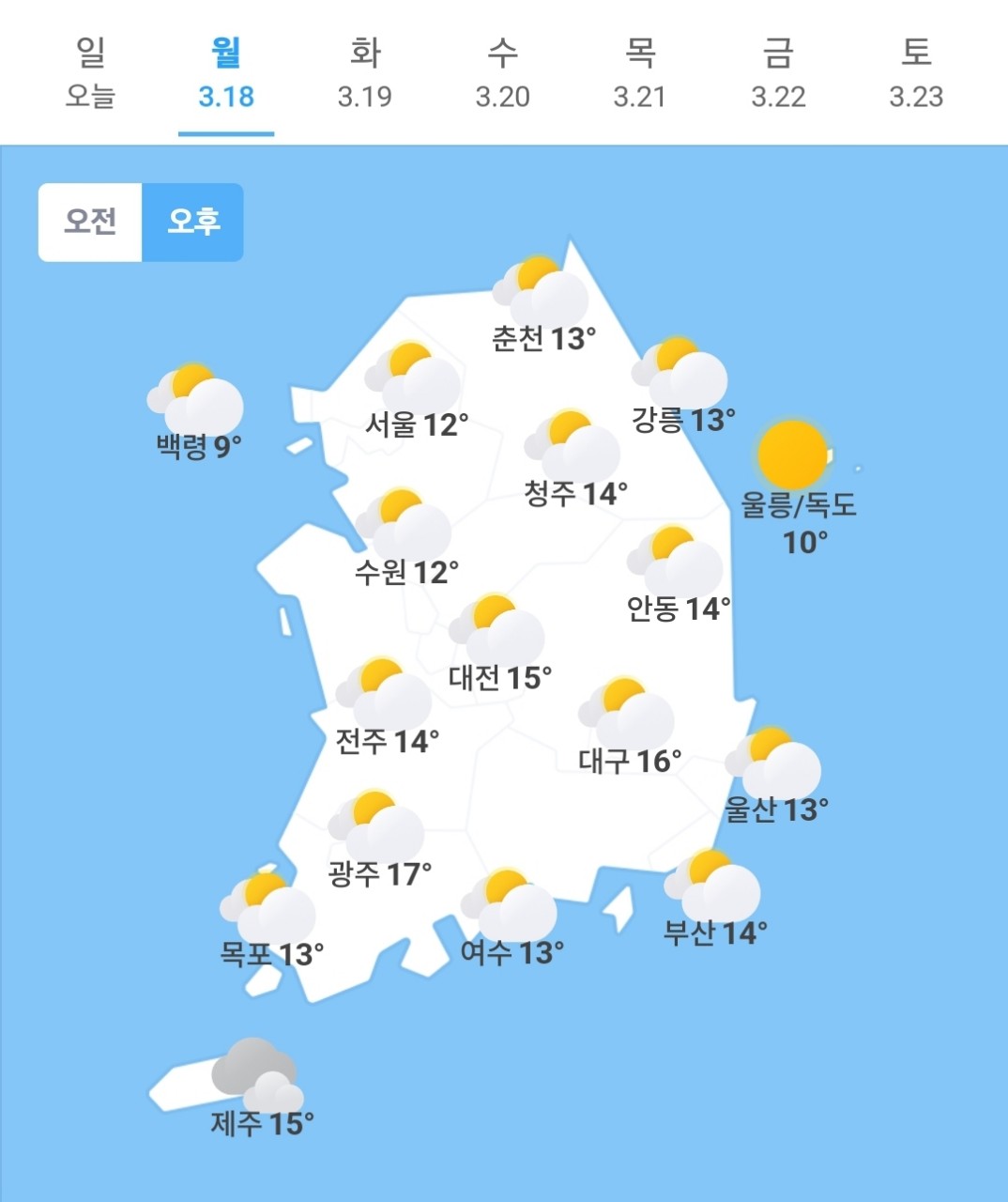 ▲ 춘천 : [맑음, 구름많음] (-3∼13) <0, 20>