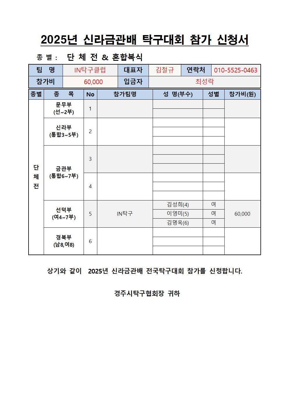 IN탁구클럽 신청합니다. 작성자최성락|작성시간25.06.12|조회수158 목록 댓글 1 글자크기 작게가 글자크기 크게가 다음검색 현재 게시글 추가 기능 열기 북마크 공유하기 신고 센터로 신고 댓글 댓글 1 댓글쓰기 답글쓰기 댓글 리스트 작성자FM핑퐁(경탁) | 작성시간 25.06.12 접수확인하였습니다. 댓글 전체보기