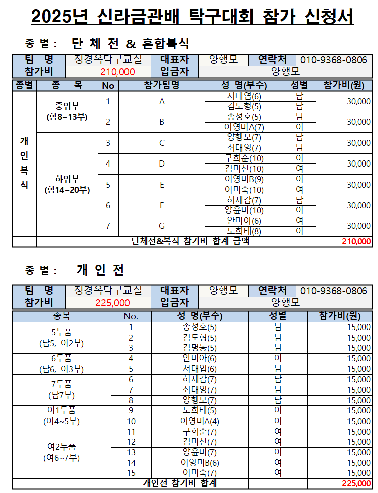 참가비 435,000(복식 210,000 + 개인전 225,000)는 금일중 입금 하겠습니다.